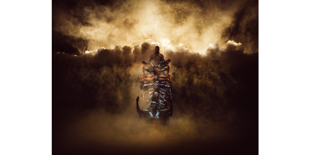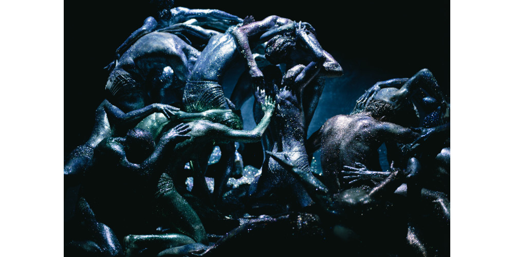 Aus dem Zentrum löst sich eine Frau und bleibt als einzige sitzen, während ein neuer Glitzerregen auf sie niederprasselt, lauter dieses Mal, plätschernd, wie dicke Regentropfen, die auf harten Boden fallen. Stroboskop-Licht lässt sie noch unwirklicher erscheinen, sie verharrt am Boden, mit biegsamen Armen und geschmeidigem Oberkörper, wie eine indische Tempeltänzerin. Langsam nähern sich wie eine Riesenschlange von oben die anderen glitzernden Gestalten, gleiten sitzend langsam über die in Nebel gehüllte schiefe Ebene und bilden alle zusammen einen riesigen Tausendärmler und -füßler, der zu immer neuen, wellenförmigen Bewegungsformationen findet, bis irgendwann das Licht erlischt und die Musik in wenigen sanften Schlägen ausklingt.