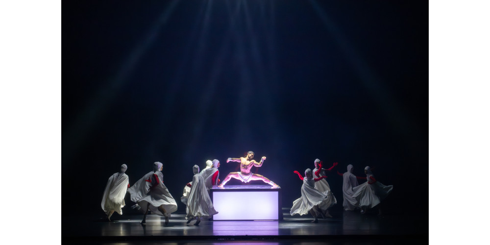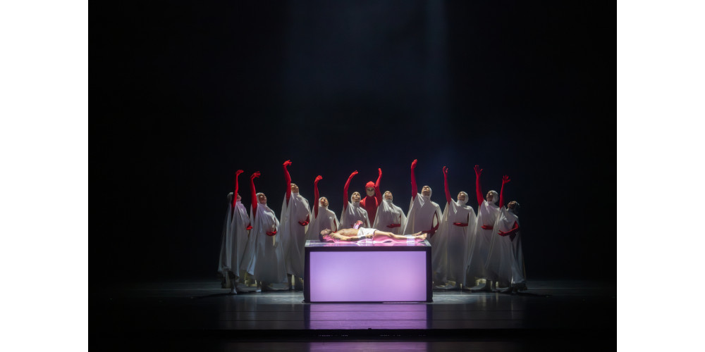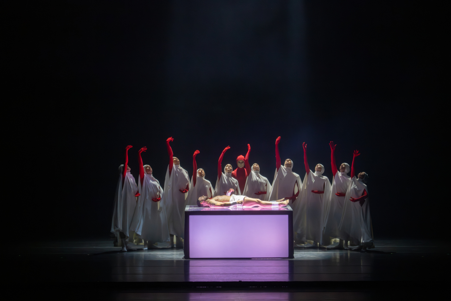 Und tatsächlich thematisiert das Stück eine Reise ins Innere, so, wie es in Urzeiten durch den Tempelschlaf (Incubatio) als heilende und regenerierende Maßnahme praktiziert wurde. Muriel Romero, seit September 2024 Direktorin der renommierten spanischen Compagnie, erforscht mit Hilfe von interaktiven Medien und elektroakustischer Musik archetypische Bilder und Praktiken der Menschheit. In einer bedeutungsschwangeren Atmosphäre, die durch Dunkelheit, durchbrochen von Lasertechnologie und einer sich langsam, aber unentwegt steigernden Soundcollage entwickelt, treten die beiden Protagonisten: der Neophyt und sein Priester, sowie zehn mönchsähnliche Figuren in weißen Kutten und Kapuzen auf. Mit ihren Händen in langen, roten Handschuhen werden sie abwechselnd auf den Neophyt einwirken, der nach anfänglicher Vorstellung auf ein altarähnliches Podest gelegt wird, um in den heilenden Tempelschlaf zu fallen, aus dem er – durch höhere Eingebung eingeweiht – erwachen soll.