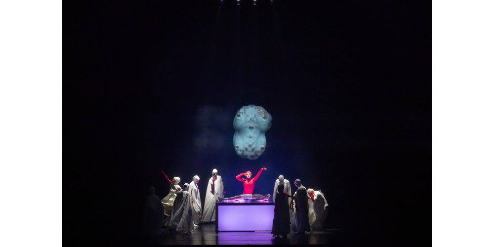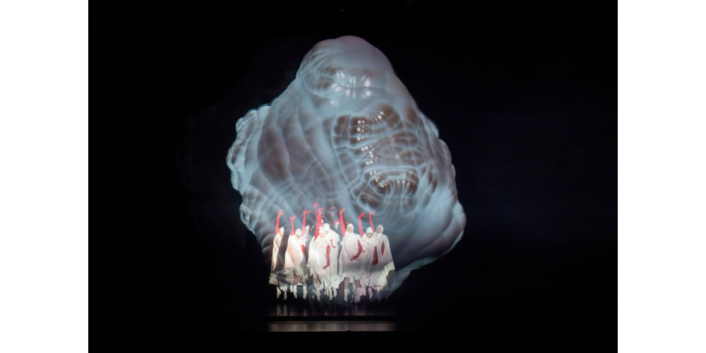 Das Ganze wirkt wie eine durch hohen technischen Aufwand inszenierte Séance, der Protagonist wird zur Marionette der Priester, die ihn unaufhörlich umkreisen (Circumambulatio) und mit ihren roten Armen, die durch das Laserlicht greifen, gleichsam elektrisieren. Dieser interessante Effekt hätte choreografisch sehr viel besser ausgenutzt werden können. Die Reise in die Träume des Protagonisten wird dabei eindrucksvoll und zugleich abstoßend illustriert durch Hologramme, die auf den Altar oder auf die durchsichtige Leinwand quer über die gesamte Bühnenbreite projiziert werden: von einem Werkzeugwesen, das sich durch Morphing in eine Schnecke verwandelt, die wiederum in eine immer größer werdende Zellwucherung bis hin zu einem pulsierenden Herzen, dessen Adern abgeschnitten sind und das die Verbindung zum Leben verloren hat.
