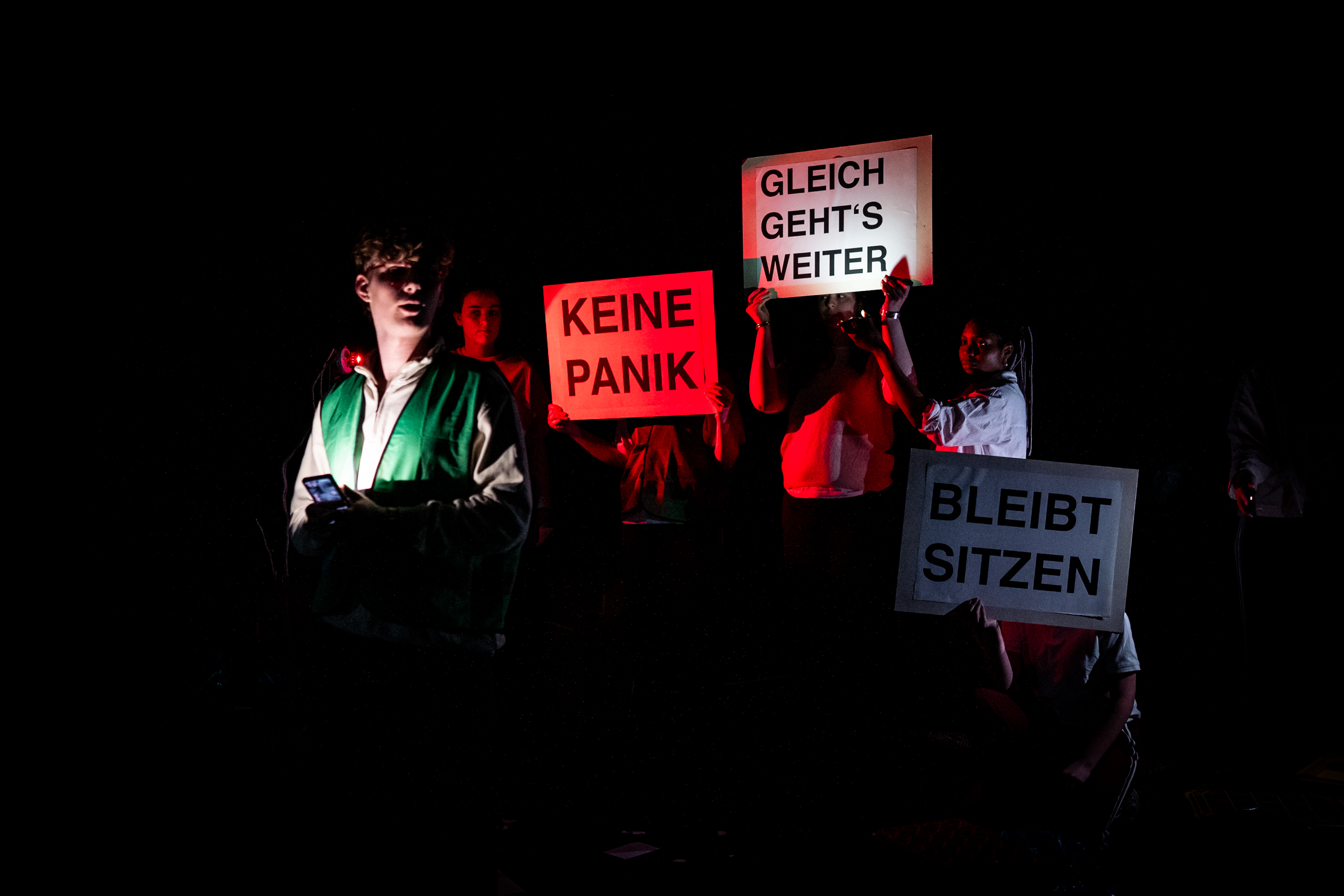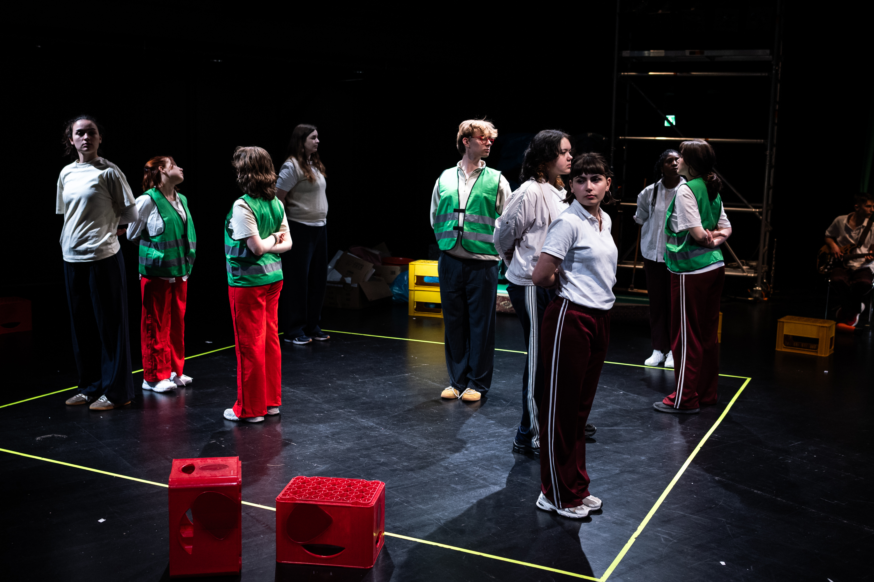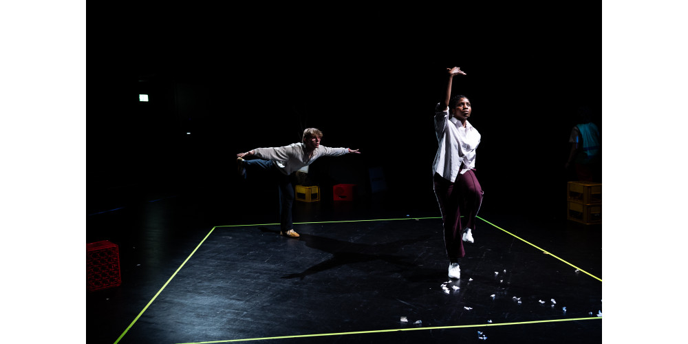 Unter dem Müll kommt ein mit neongelbem Tape abgeklebtes Quadrat auf dem Boden zum Vorschein. Eine Darstellerin erzählt, dass sie im Rahmen der Recherche zum Stück eben dieses Quadrat in der Düsseldorfer Innenstadt aufgeklebt habe – verbunden mit einer Umfrage zum Thema „Demokratie“. Während sie gewonnene Einsichten und Aufnahmen von diesen Passant*innengesprächen mit dem Publikum teilt, stellen die Kolleg*innen das Erzählte im Quadrat nach. Dieses wird auf der Bühne zum Symbol des demokratischen Raum voller Möglichkeiten.
