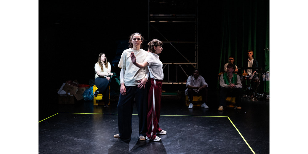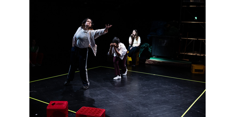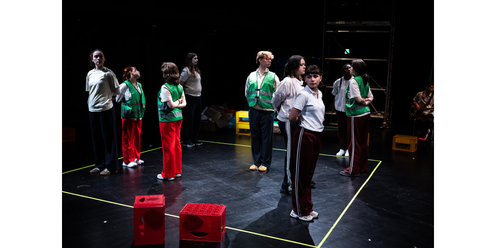 „Democratic Playground – Exploring the room“ ist ein Projekt des Jungen Forum Freies Theater in Düsseldorf. Die Künstler*innen Stefanie Elbers und Oleg Zhukov sehen sich selbst, wie auf der Website zu lesen ist, als „Kompliz*innen“ der jugendlichen Darstellenden, die als Ko-Autor*innen genannt werden. Diese Arbeitsweise spiegelt sich auch in der Inszenierung wider: Alltagsszenen und Fragen der Jugendlichen dienen als Inspirationsquelle die Szenen. Ihre Sichtweisen auf demokratische Prozesse dienen dabei als verbindendes Element. Die musikalische Leitung der Band, die den gesamten Abend im Hintergrund plätschernd auf der Bühne begleitet, liegt bei Kornelius Heidebrecht.