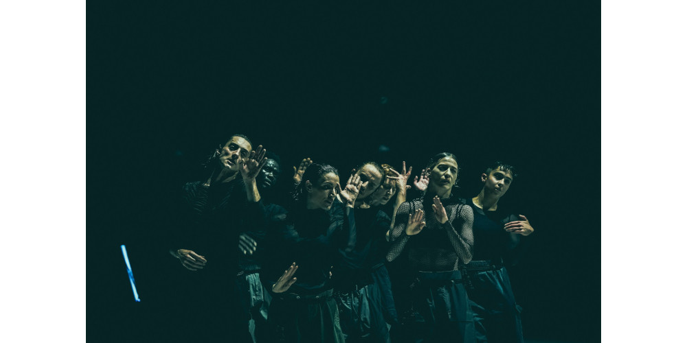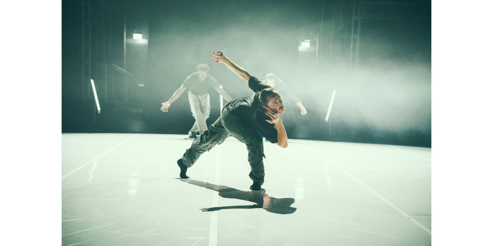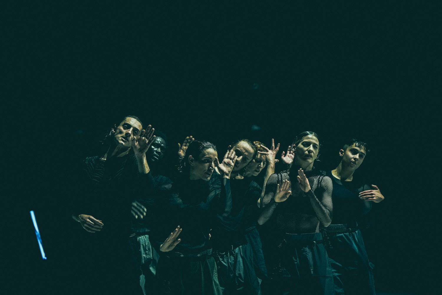 Dieser äußerst differenziert ausbuchstabierte Totentanz lebt von seinen Zwischenräumen, den Leerstellen zwischen den sieben Tänzern. Das Publikum kann sich noch erinnert fühlen an die Drehscheibe, deren beständige Bewegung die Präsenz einer „dritten“ Energiequelle zu vermitteln schien. Das weiße Rund auf dem schwarzen Boden ist noch immer durch die niedrigen Schweinwerfer an dessen Rand begrenzt. Diesen mit Energie aufgeladenen Kreis verlassen die Tänzer*innen nur für Auf- und Abgänge. In ihm lebt etwas nicht Greifbares. Es scheint durch den Raum zu fliegen. Reglos fixieren die Tänzer*innen einen beweglichen Punkt. Durch sie hindurch geht diese Energie, lässt sie verharren und verursacht ein verzerrtes Zittern, dass an eine Bildstörung erinnert.