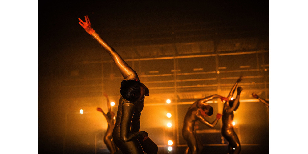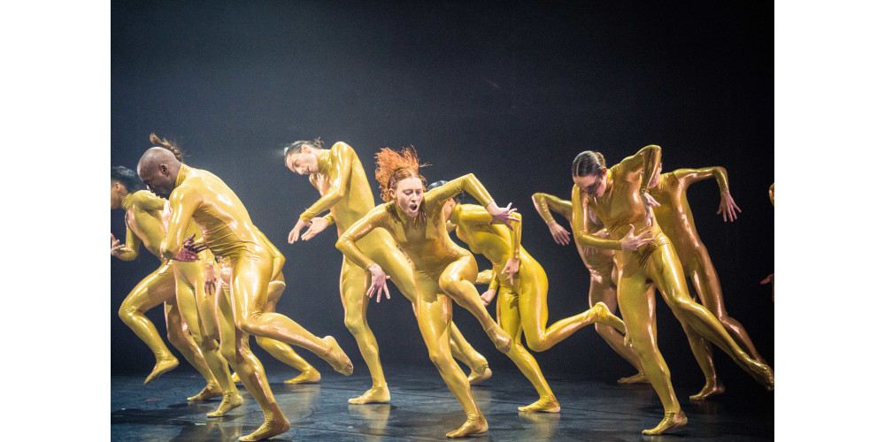 Fast will man meinen, in einigen Bewegungsansätzen bereits eine Ankündigung dessen lesen zu können, was im zweiten Stück mit „tHE bAD“ von Hofesh Shechter folgen wird, vorausgesetzt, man kennt das Stück (Uraufführung: 2015 in Manchester) noch nicht, wohl aber andere Arbeiten Shechters. Und dann kommt doch alles anders. Ganz anders. Keine hintergründige Emotionalität, keine rätselhafte Verzauberung, keine individuellen Charakterköpfe in ausgeklügelten Gemeinschaftskonstellationen. Die 12 Tänzer*innen des Ensembles stecken hier allesamt in goldenen Zentai (Bodysuit). Individualität spiegeln nur Kopf und Hände.