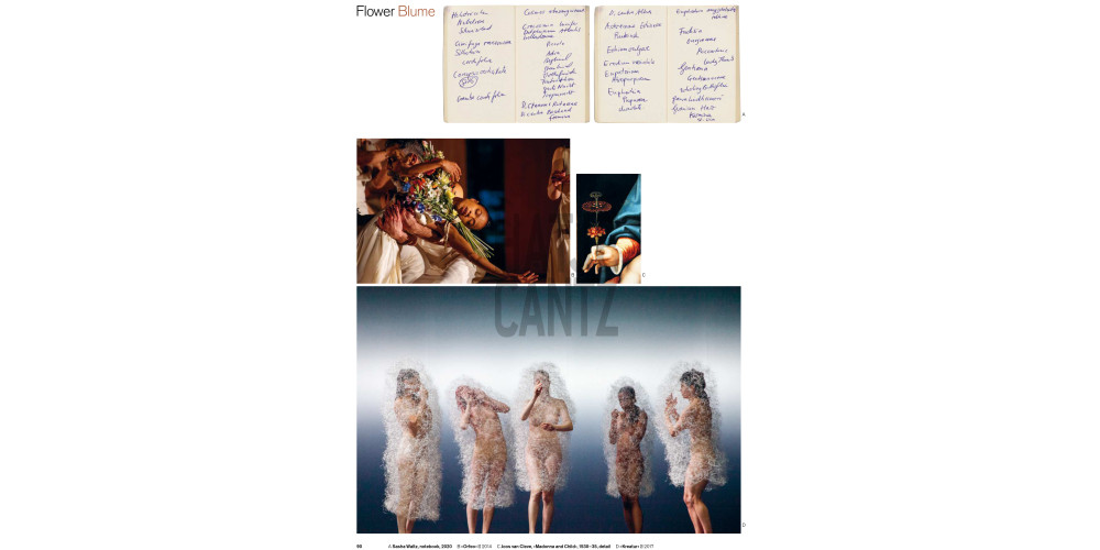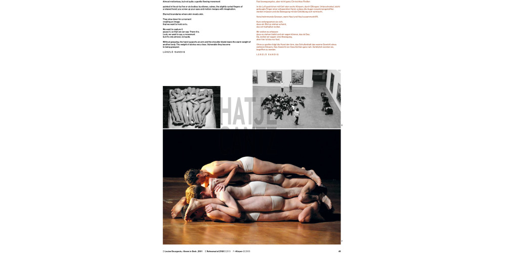 Zarte Gebilde wie „Blumen“ oder „Ei“ fügen sich zu kleinen Codes, im Gegensatz zu „Schlangen“ oder „Linien“, in denen sich liegende, ausgestreckte Tänzerinnen und Tänzer festhalten und durch gigantische leere Museumsräume winden. Weitere Collagen folgen, etwa zu „Flüssigkeit“ und „Wasser“: Auf einer Doppelseite Fotos der Oper „Dido & Aeneas“ mit tauchenden Tanzenden in riesigen Aquarien. Auf einem Foto trinkt die Tänzerin einen Schluck aus einer Pfandflasche. Spektakuläres und Banales…