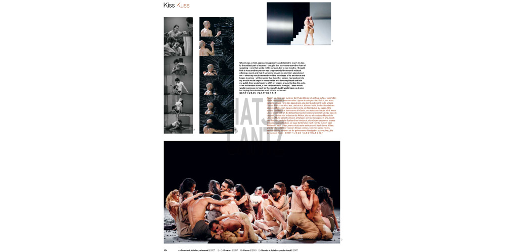 Für jedes Jahr von 1993 bis 2024 ist nachzulesen, welche Arbeiten neu entstanden oder wiederaufgeführt wurden. Dazu gesellen sich Szenenbilder und kurze Beschreibungen neuer Choreografien. Im ersten poetischen Abschnitt der Publikation wurden sämtliche Fotos mit einem winzigen Quellvermerk versehen, das Nachschlagen der Stücke im zweiten Teil wird empfohlen.