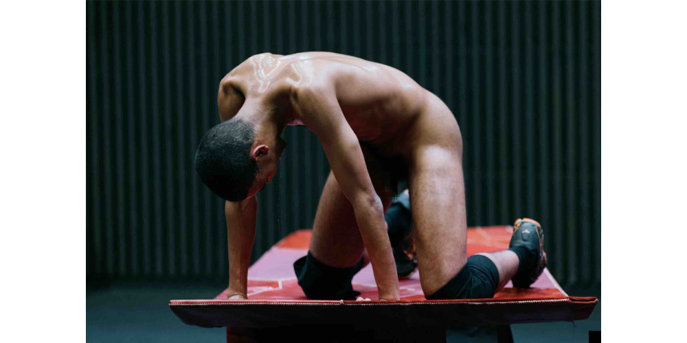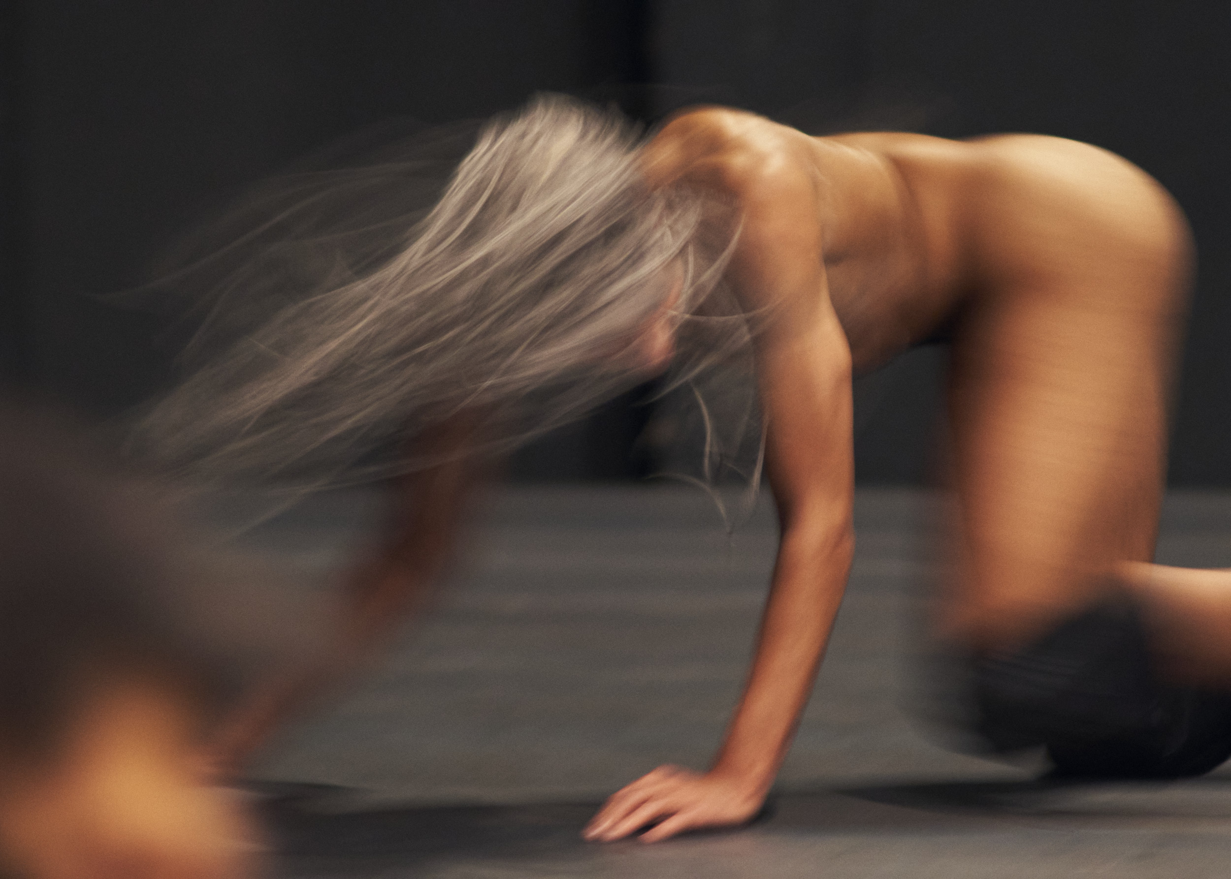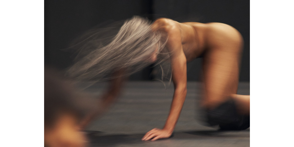 Nicht unbedingt aus dem Voguing aber doch aus der queeren Subkultur speist sich die Choreografie „Batty Bwoy“ des kanadisch-jamaikanischen Tänzers Harald Beharie. Er schlüpft nicht in Kostüme, sondern stellt in der Residenz des Schauspiel Leipzig gleich seinen eigenen nackten Körper zur Verfügung, indem er Zuschauenden erstmal mit dem entblößten Anus begrüßt – bei gleißendem Bühnenlicht. Der titelgebende Begriff stammt aus dem weiten Feld der homophoben Beleidigungen und verweist zugleich auf seine jamaikanische Herkunft. Drastisch und ironisch nimmt er Posen aus dem queeren Ballroom auf und wendet sie auf links. Animalisch wedelt er mit langen blonden Braids über die Bühne, kriecht und giert, versammelt alle Projektionen auf den wilden schwarzen Körper in seiner Performance.