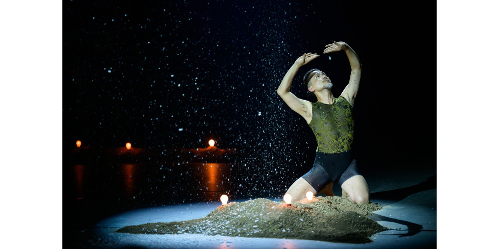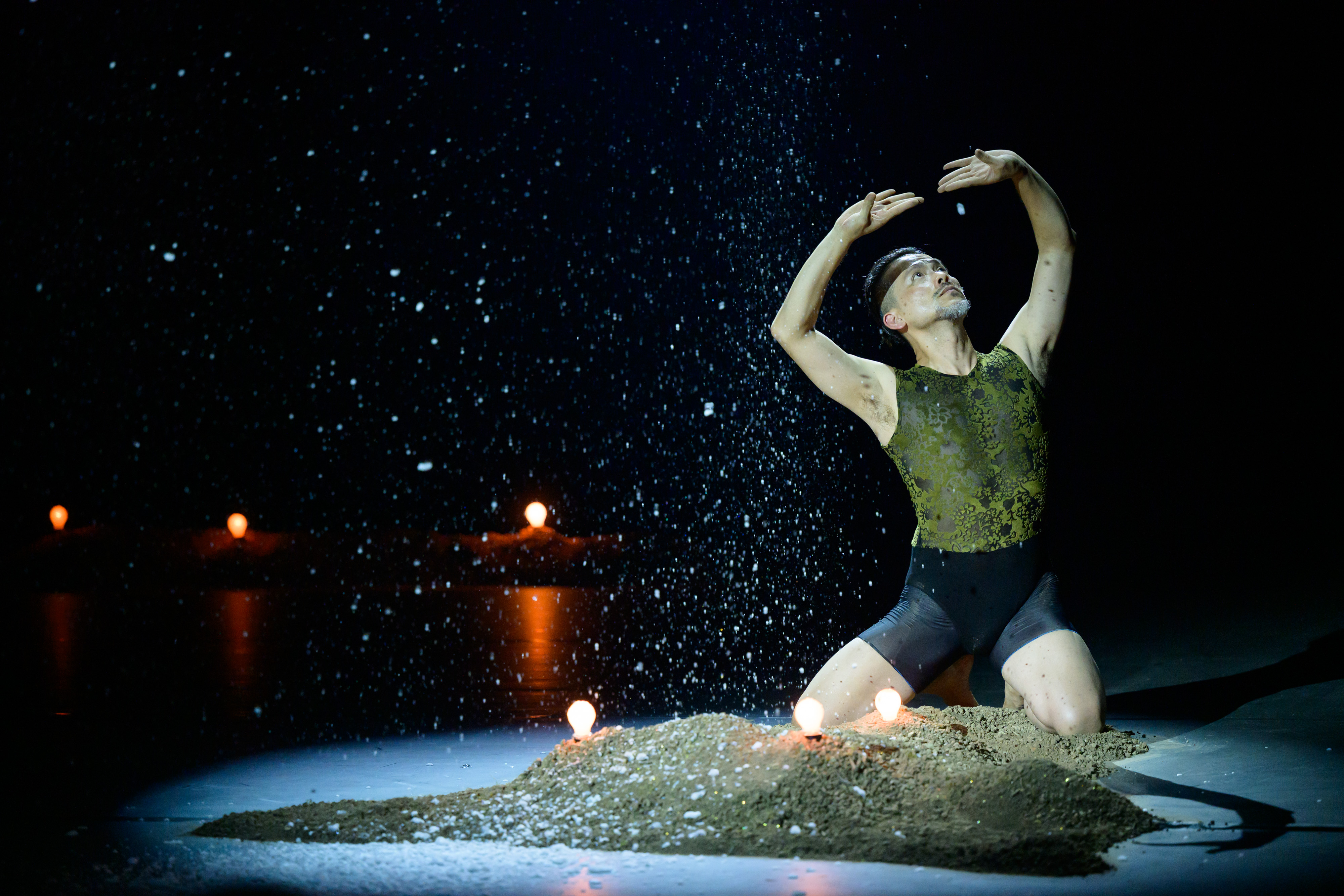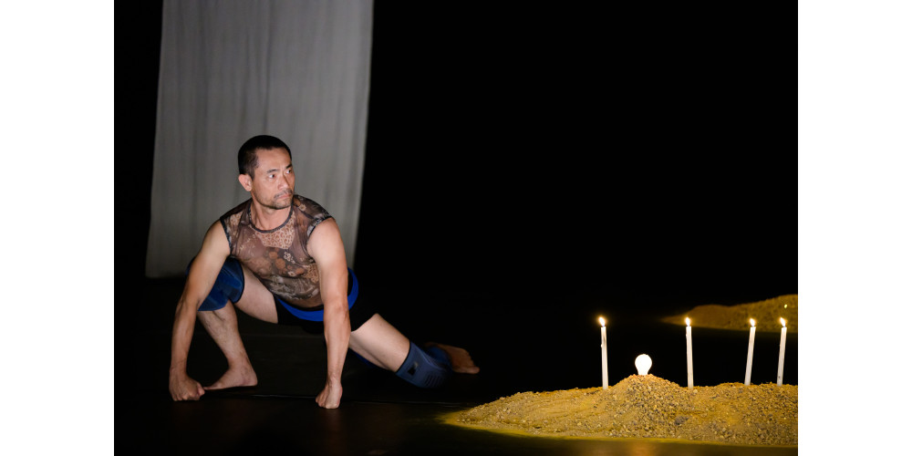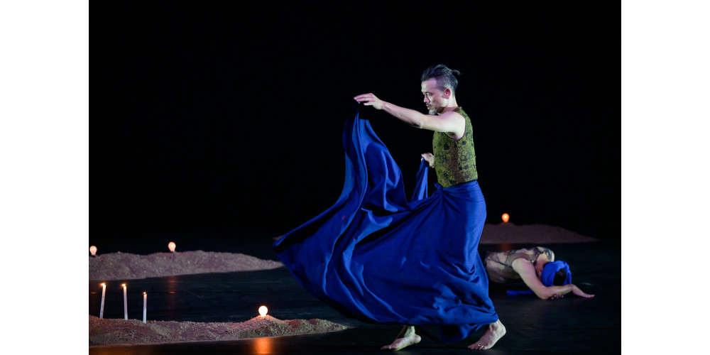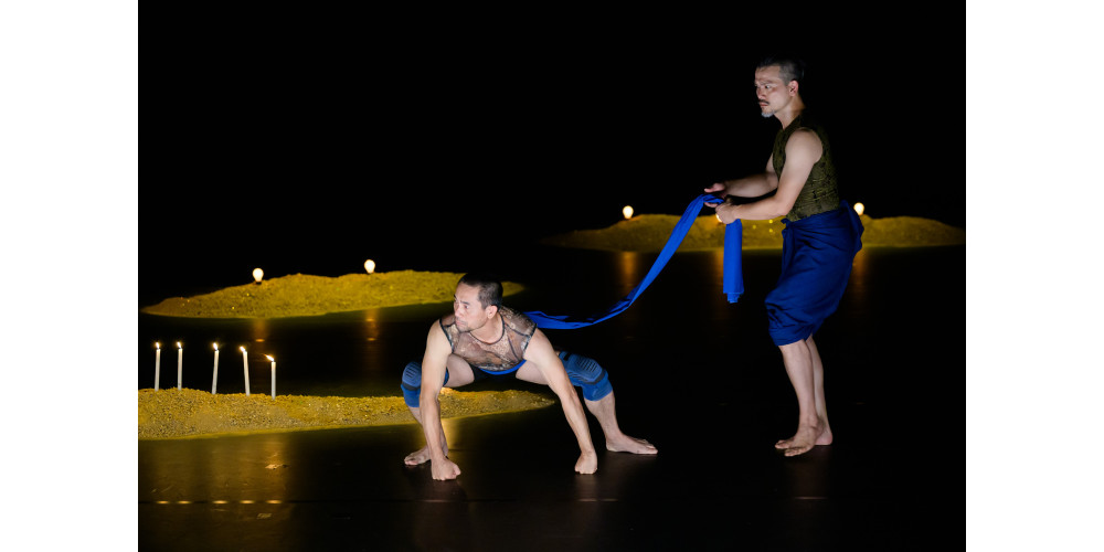 Viel Kontext ist das nicht und Chen Wu-kang erzählt, bevor die beiden – nun ohne Glitzerklamotten – in den Tanz einsteigen, einmal die Geschichte des Prinzen. Pichet Klunchum holt das blaue Tuch, das in zahlreichen Anverwandlungen das Kostüm sein wird für alles, vom Bühnenhimmel, und zwischen den braunen Sandbergen mit 13 Lichtern kann das Geschichtenerzählen beginnen. Und damit ein großes Rätsel der Assoziationen.