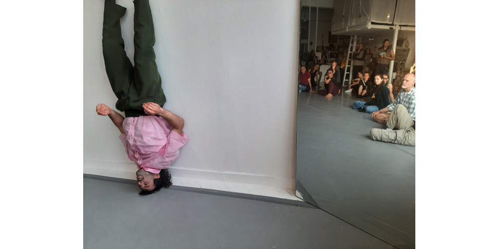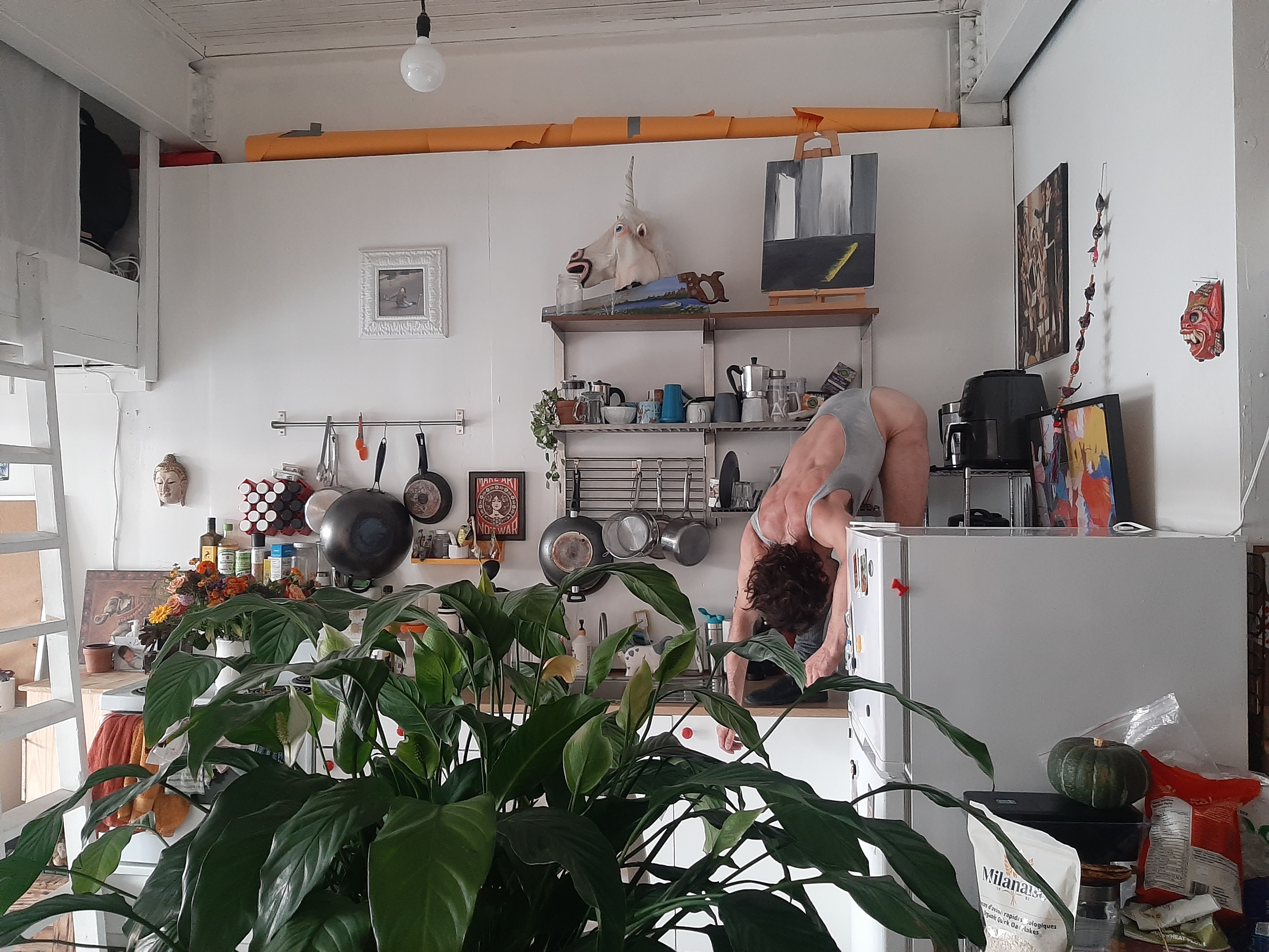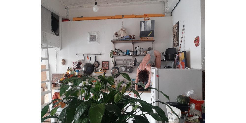 Above our heads, some sort of gallery, huddled into it a generous bed. He gets up there, performes along a thick pipe. He gets down back on the floor, crawls over the sofa and leans against the wall, upside down. It's not about what he does. Maybe it's about how he does it. It's definitely about where he does it. And why.
