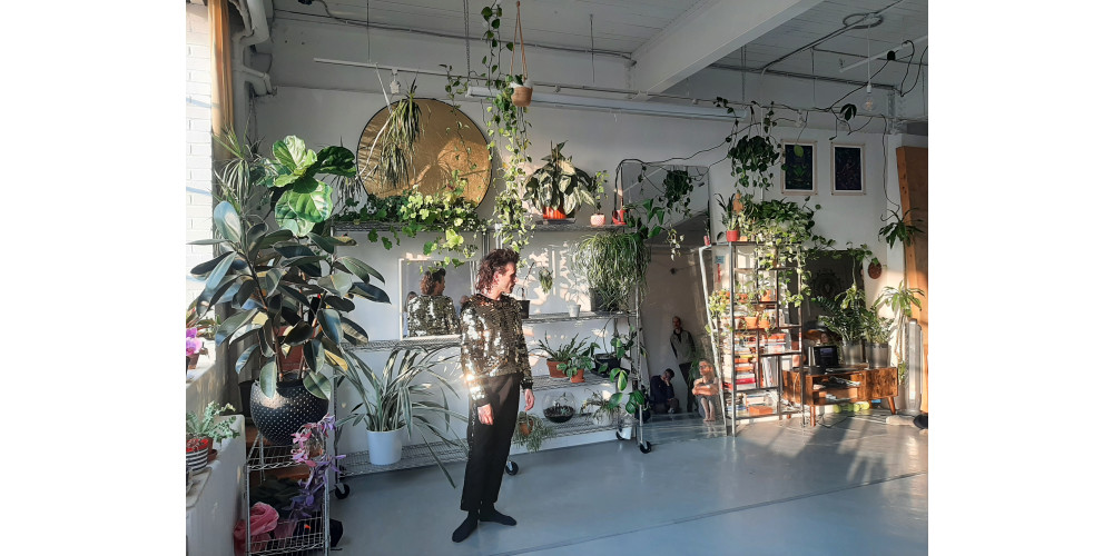 The next thing I know is I went through a door to my right. I'm standing in a huge hall, some estimated 70 square metres or even more. One big window along the opposite wall, made of numerous small panes. There are about 50 people, sitting on chairs around a massive dining table. Next to it, a complete kitchen, further down a sofa, crowded with people. They lean against the wall. Over by the window, closer to the daylight, a rack with plants, more plants and even more. A big mirror in the corner. The floor really is covered in white marley floor. To good to be true, but it is. Anyway, before long, Charles-Alexis is squatting on the fridge. And I think to myself: What a wonderful world. Actually, I made that up. I don't remember, what I thought. But I instantly knew, that this was a moment to remember. Because we were standing right in his home. This place is where he lives and works.