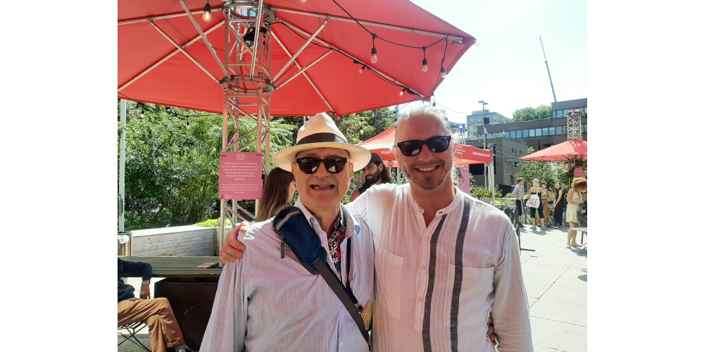 I hasten to catch up, and he turns out not to know his ways around inside. Then, close to a narrow staircase, a tiny version of the festival poster. So we climb up the stairs. Finally, in a long hall way, it's Caroline sitting at a desk. She's part of the amazing team running the festival. Just as I'm about to start a wild mix of apologies for being late and complaints about the lack of information, she calmly asks me to take of my shoes. What the heck?!
