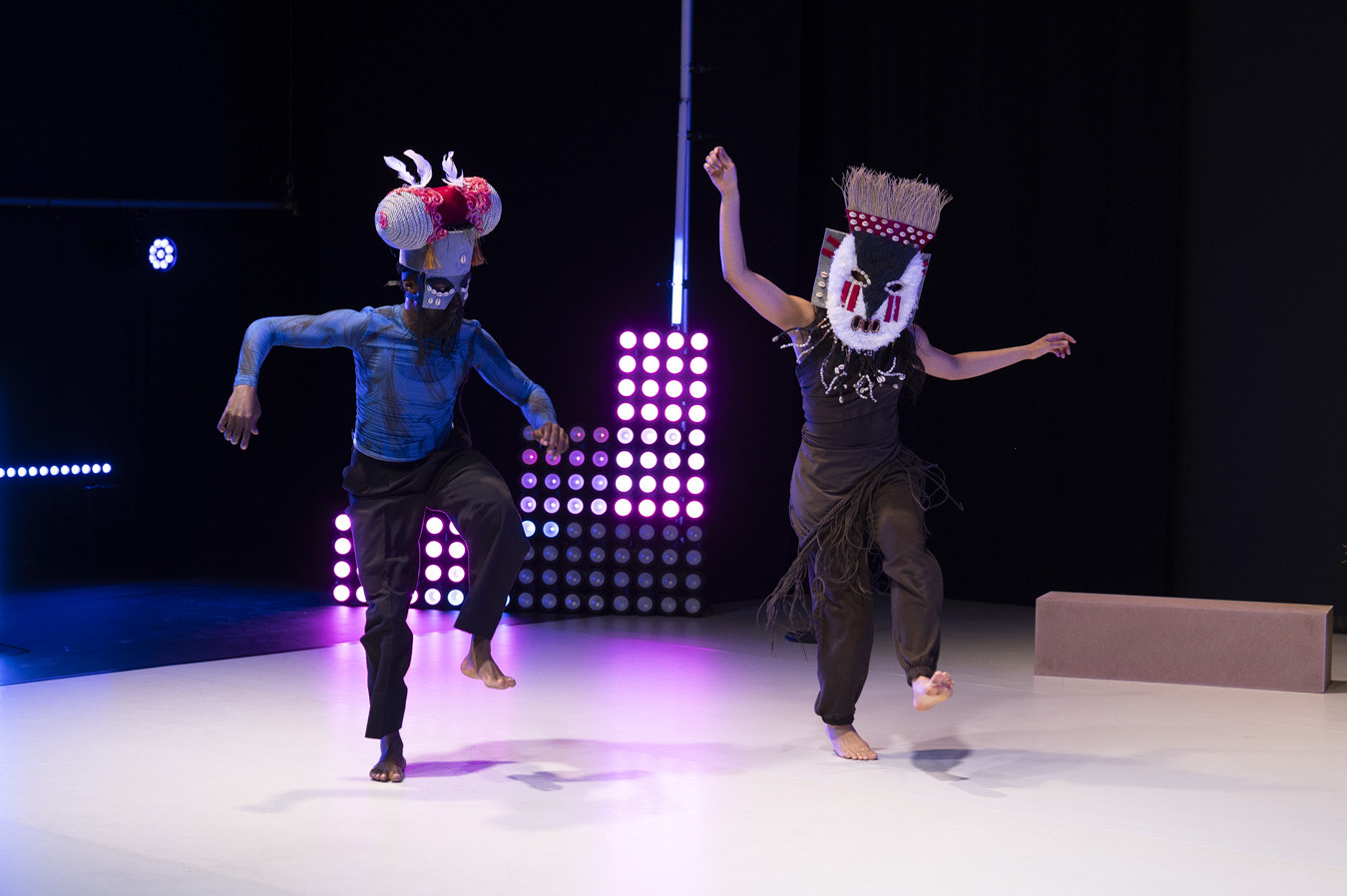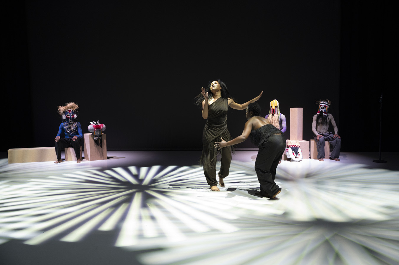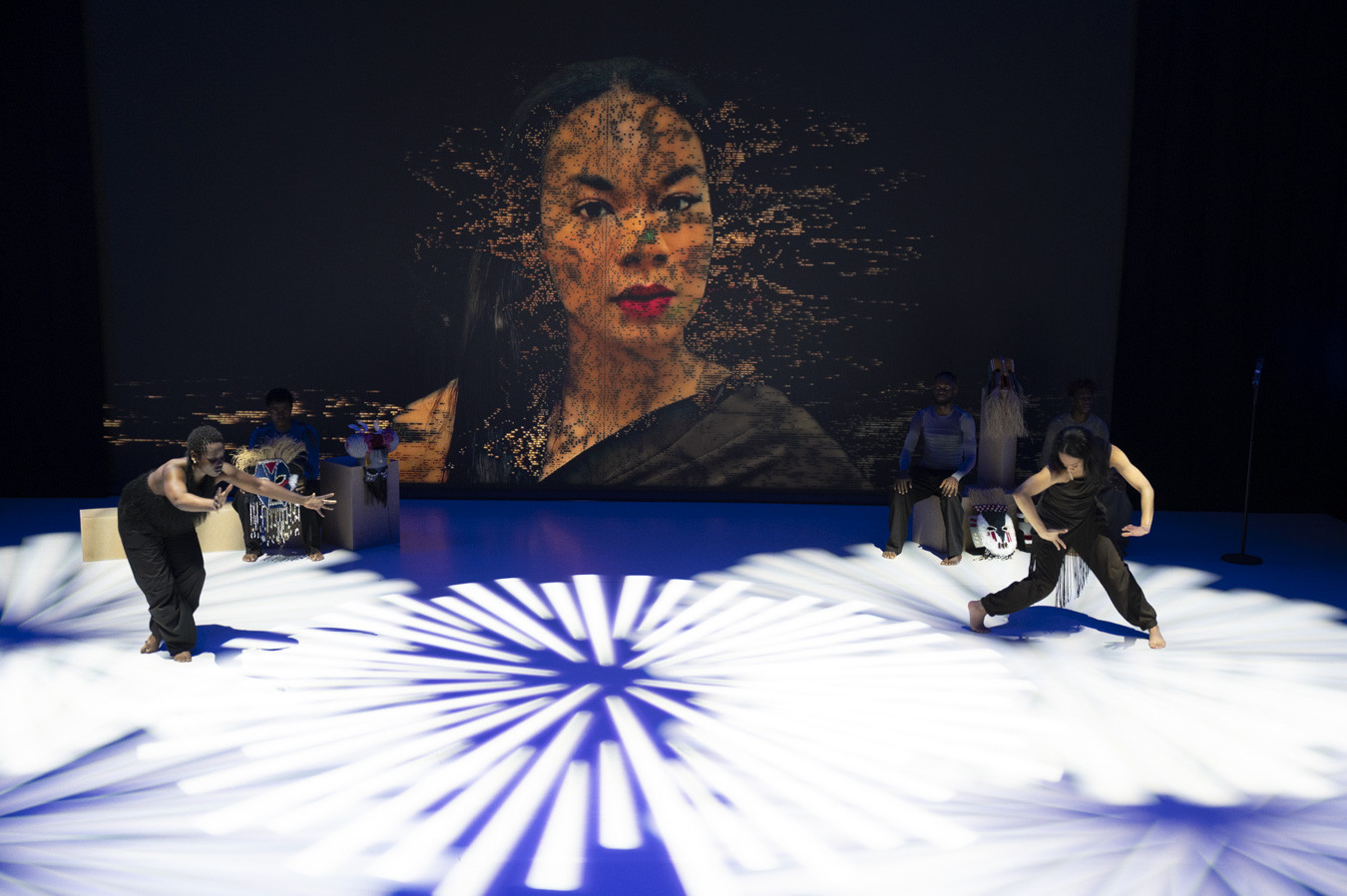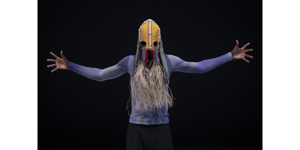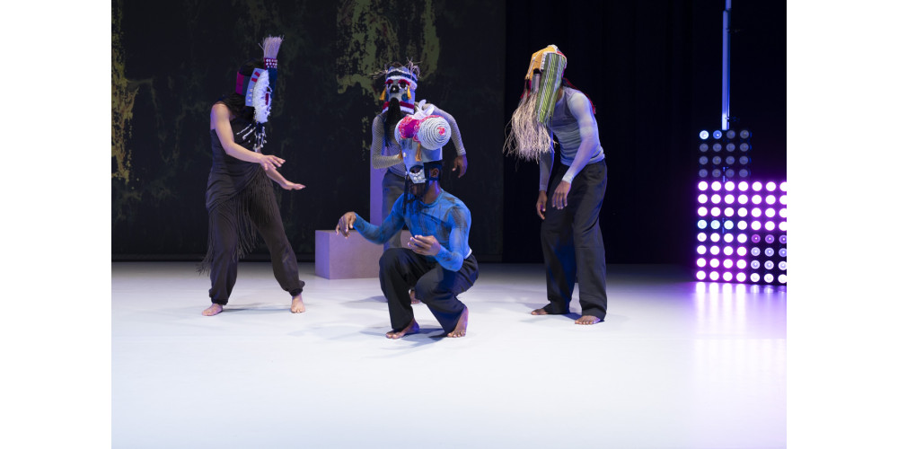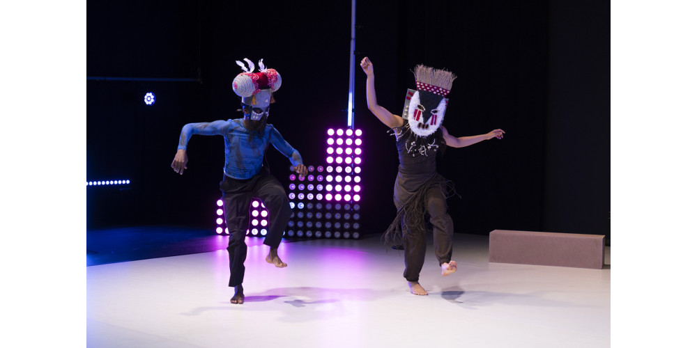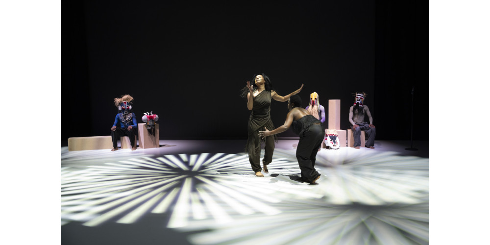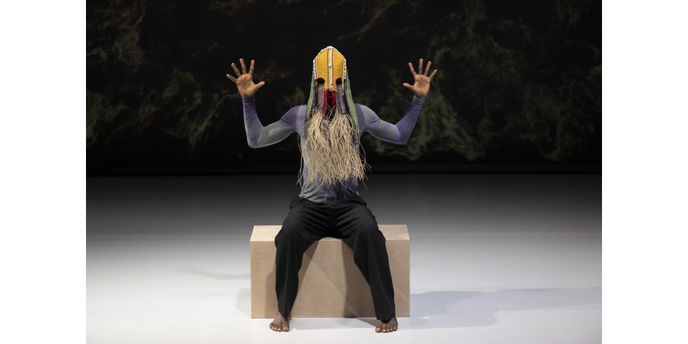 Fünf Tänzer*innen, Masken und eine Videowand bilden das Setting zu „Whispers of Wood“ von Christoph Winkler. Sie tauchen ein in eine erfundene Welt von ChatGPT. Ein gelungener afrikanischer Abend mit Gesang, Tanz, Video und Zwiesprache mit dem Chatbot.