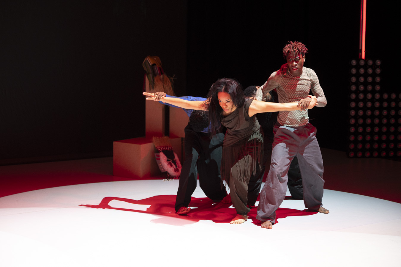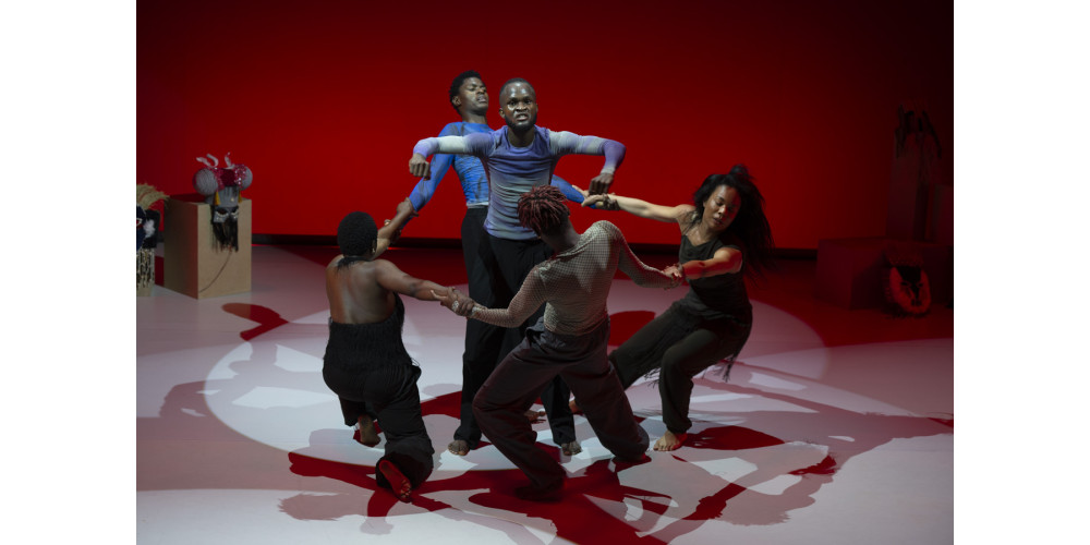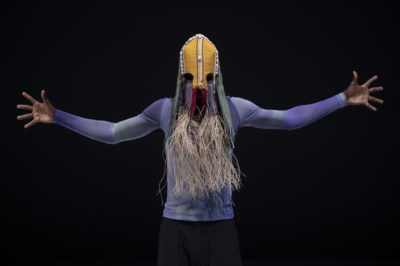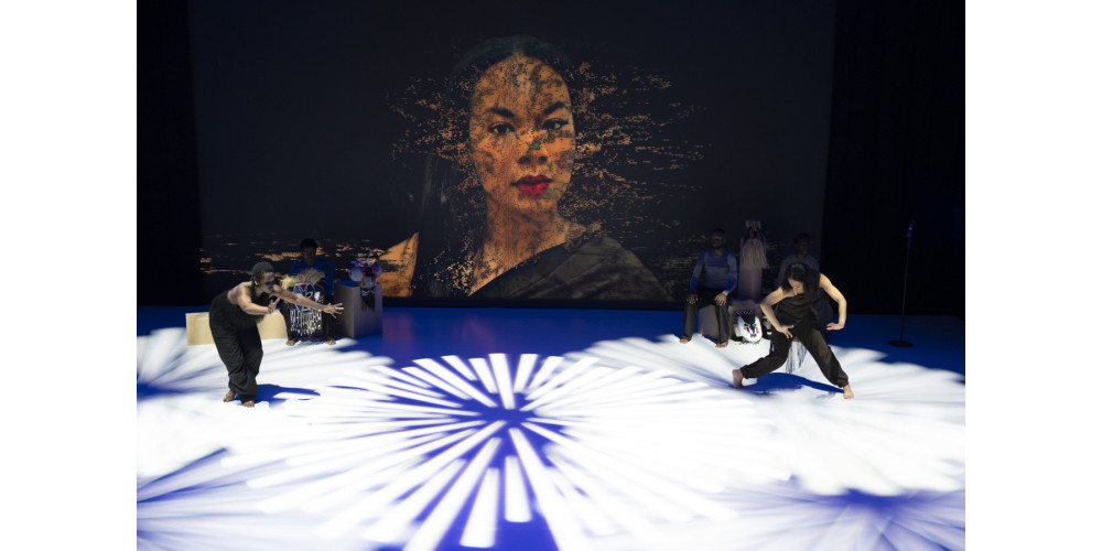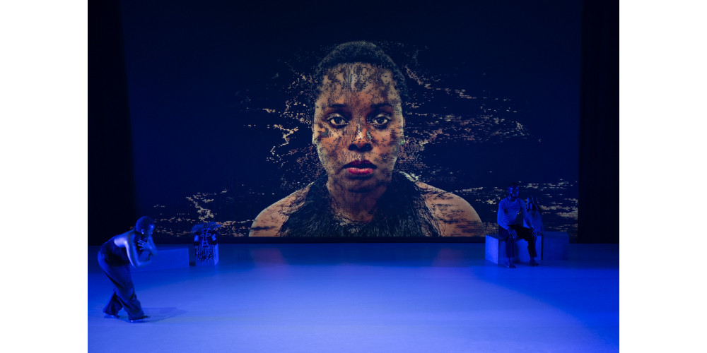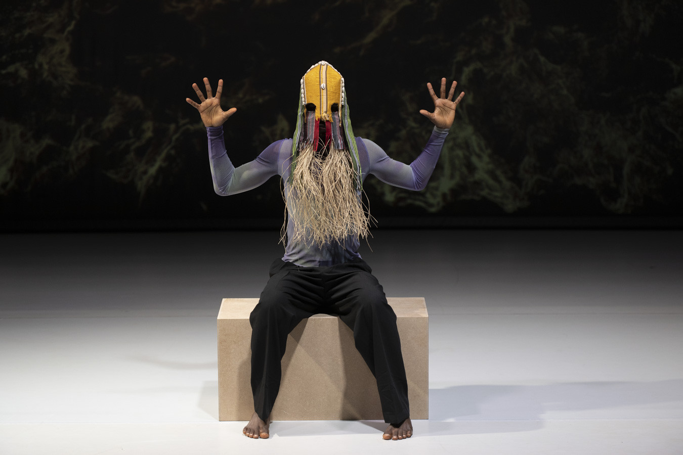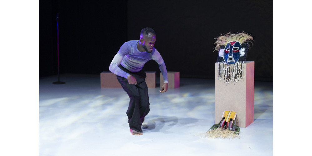 Fünf Tänzer*innen, Masken und eine Videowand bilden das Setting zu „Whispers of Wood“ von Christoph Winkler. Sie tauchen ein in eine erfundene Welt von ChatGPT. Ein gelungener afrikanischer Abend mit Gesang, Tanz, Video und Zwiesprache mit dem Chatbot.