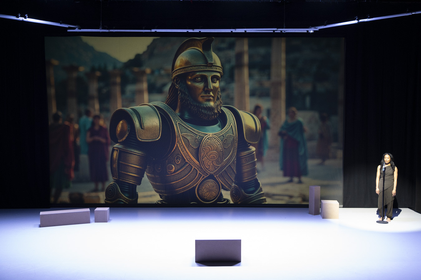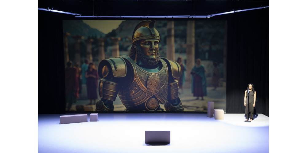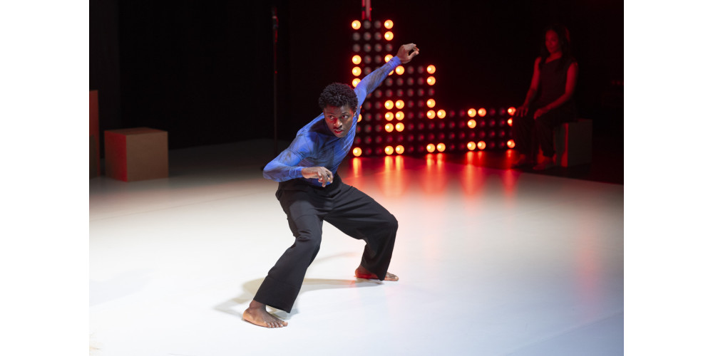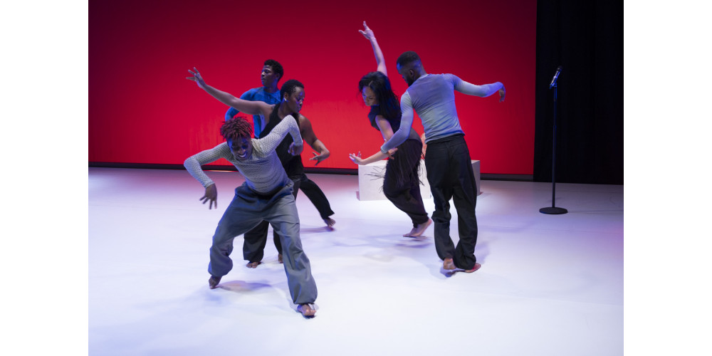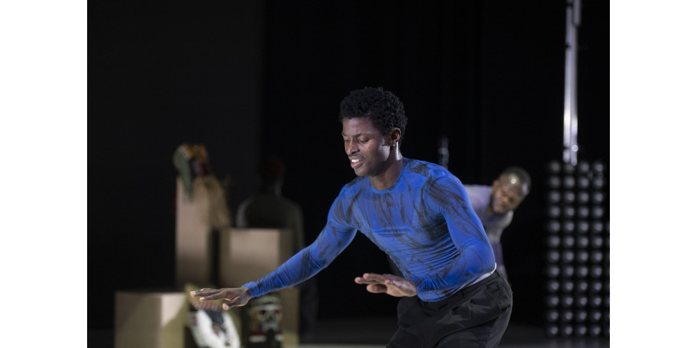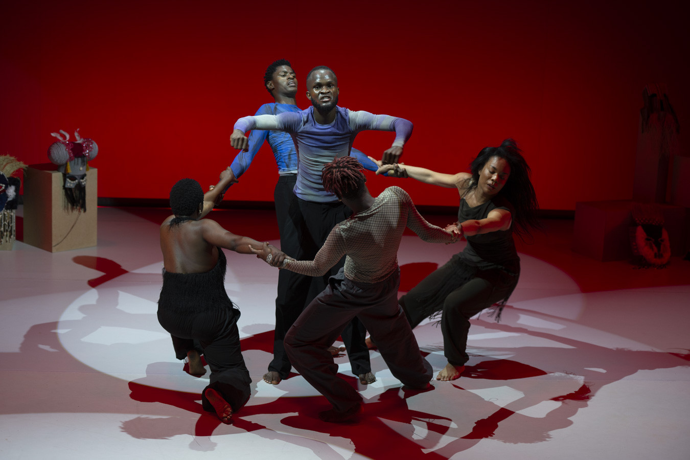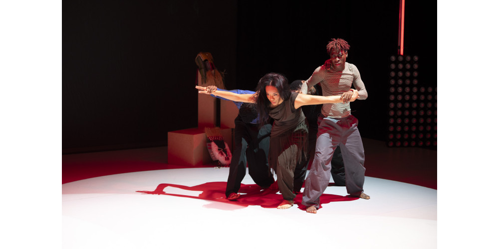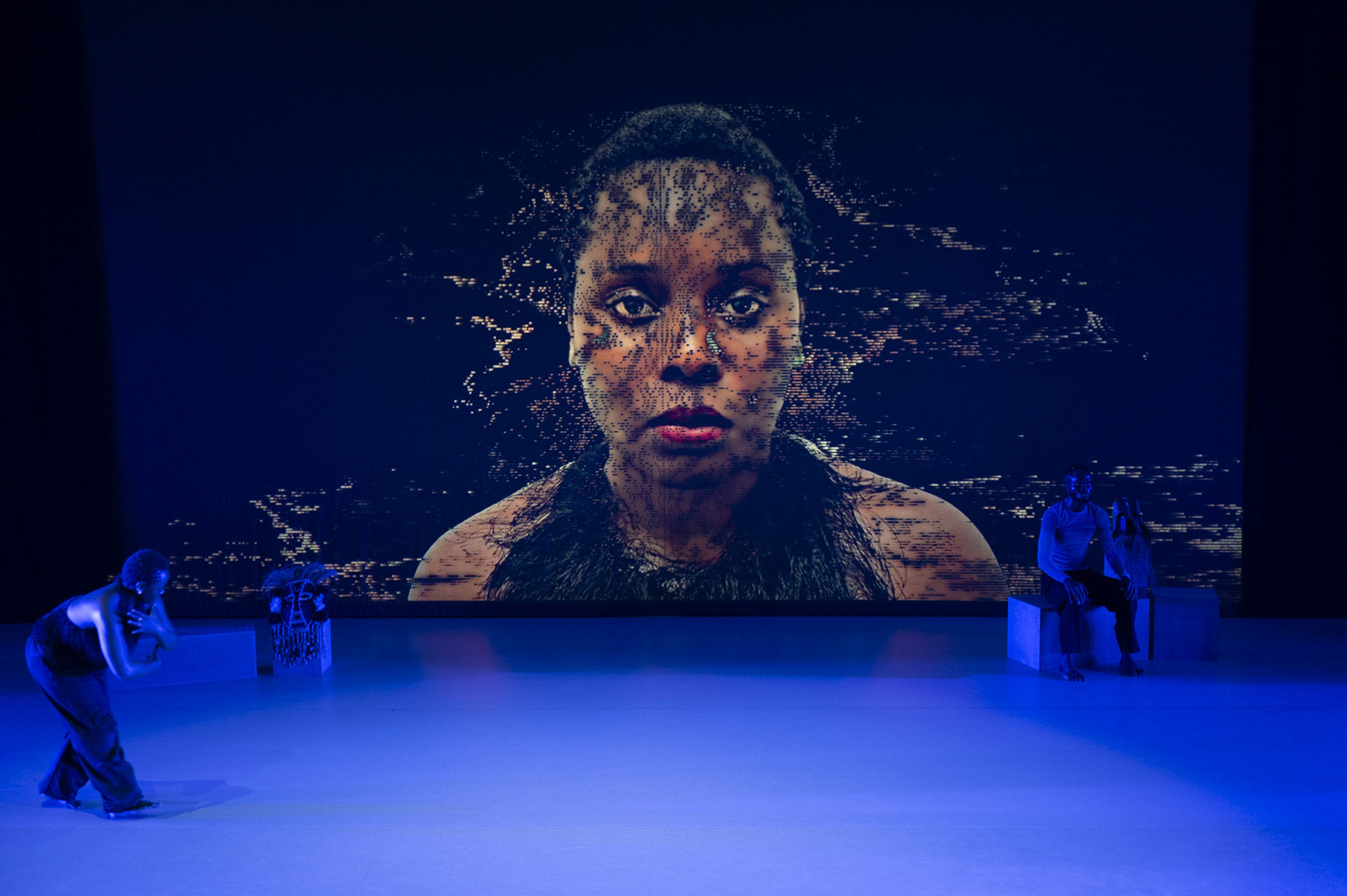 Fünf Tänzer*innen, Masken und eine Videowand bilden das Setting zu „Whispers of Wood“ von Christoph Winkler. Sie tauchen ein in eine erfundene Welt von ChatGPT. Ein gelungener afrikanischer Abend mit Gesang, Tanz, Video und Zwiesprache mit dem Chatbot.
