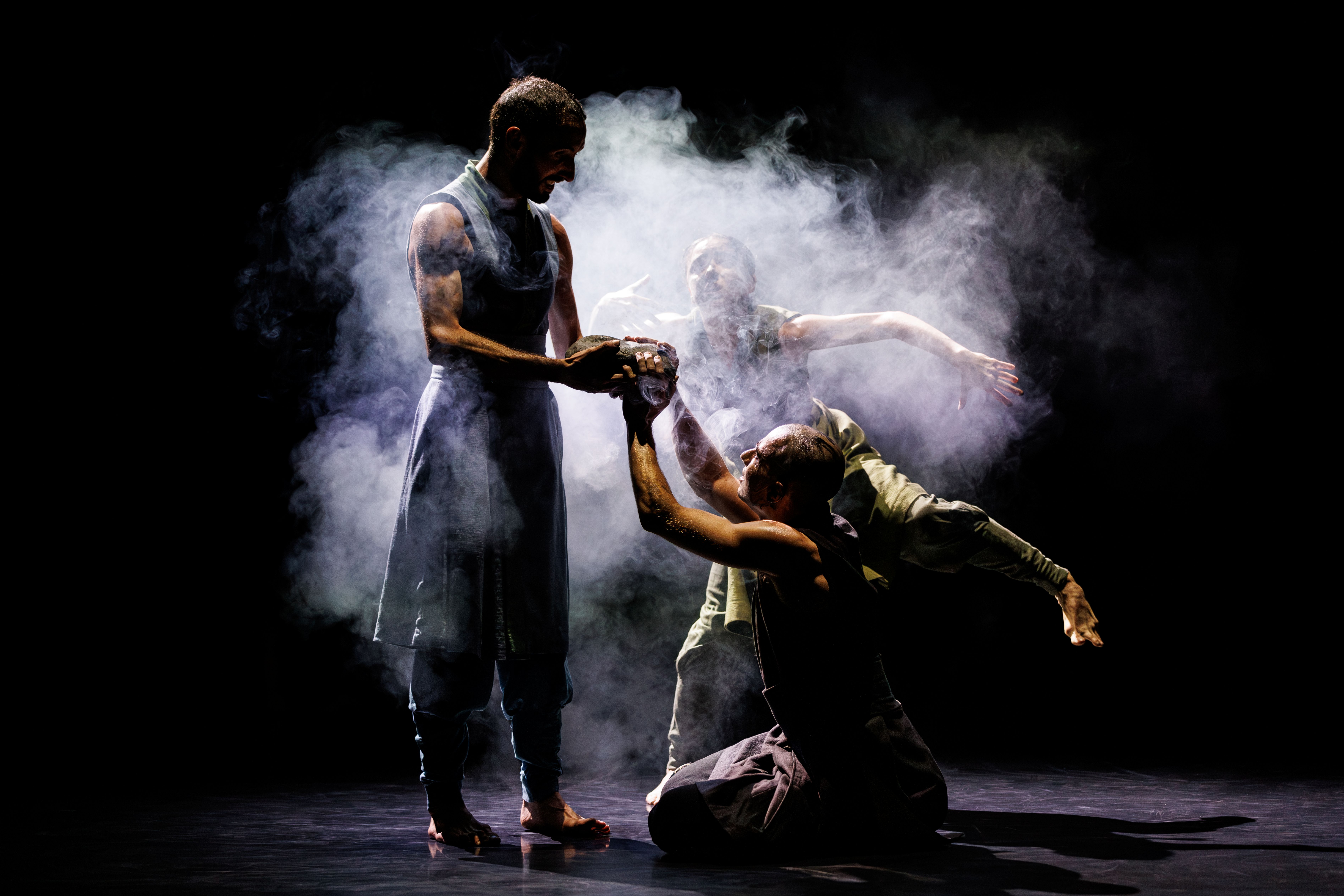 „Turning of Bones“ beruht auf einem alten Brauch aus Madagaskar, demgemäß die Knochen von Verstorbenen alle paar Jahre ausgegraben und – mit neuen Tüchern umhüllt – bei einem Tanzfest wieder der Erde anvertraut werden. Auch Akram Khan hat einige „alte Knochen“ aus fünf früheren Werken ausgegraben, geputzt und neu gekleidet, Teile aus „Desh“ (2011), „Mud of Sorrow“ (2012), „iTMOi“ (2013), „Jungle Book reimagined“ (2022) und „Insirgents“ (2024). Wer diese Stücke gesehen hat, wird einzelne Bewegungsmuster in „Turning of Bones“ durchaus wiedererkennen, aber sie sind so raffiniert versteckt und durchgeschüttelt, dass alles doch völlig neu aussieht.