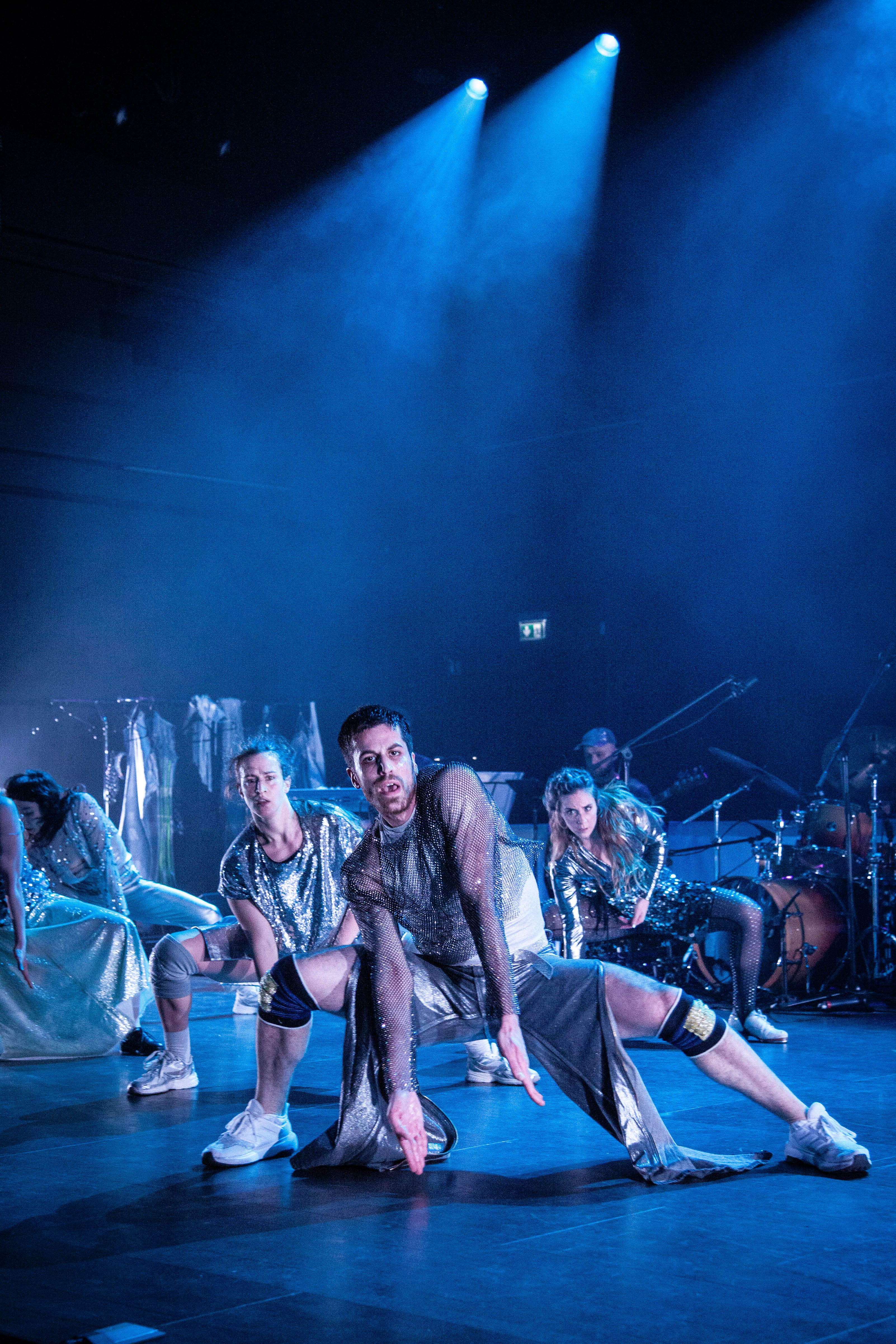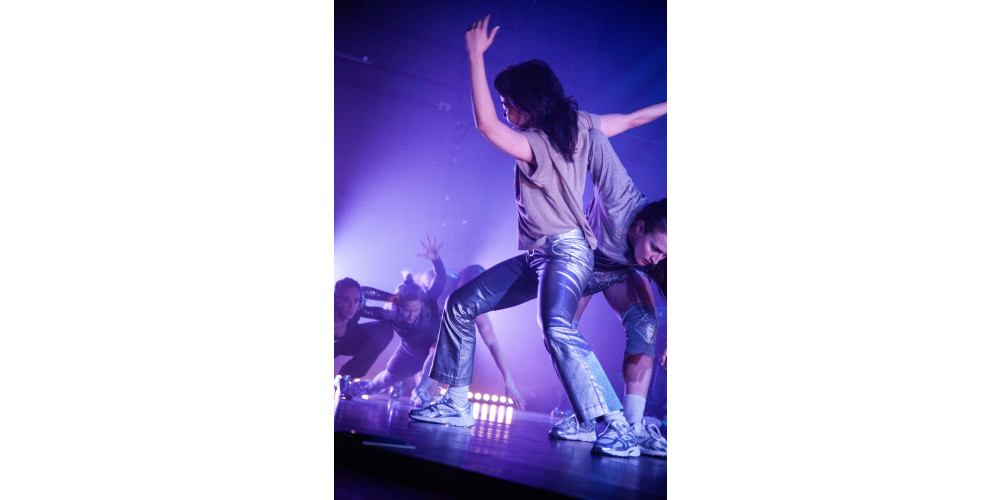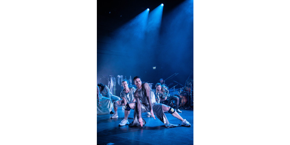 Discobeats wummern durch den Raum, Nebel quillt in den Zuschauerraum und das Licht flackert bunt über die Szenerie. Bei „Glitz“ im Leipziger Lofft ist schon zum Einlass Party. Die sieben Tänzer*innen stecken in glänzenden clubreifen Kostümen und werden durch eine fünfköpfige Band unter der Leitung von Steffen Greisinger unterstützt, die langsam die Dance-Musik aufnimmt und ablöst in krachenden Rock, zu dem die Tanzenden entsprechende ikonische Posen üben.