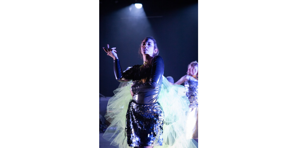 Doch erstmal braucht es Glitz. Ein großer Garderobenwagen, bestückt mit allerlei glitzernden Pling-Pling-Klamotten wird auf die Bühne geholt und geplündert. Minutenlang ziehen die sieben Tänzer*innen sich um, tauschen sich durch Fransenärmel, Glitzerröcke und Tüll-Umhänge. Die große Party, sie fällt nicht vom Himmel, sondern bedarf großer Vorbereitung und Präsentation in einer ironische Modenschau.
