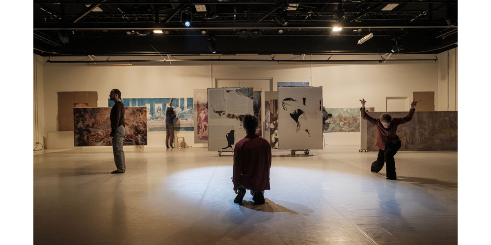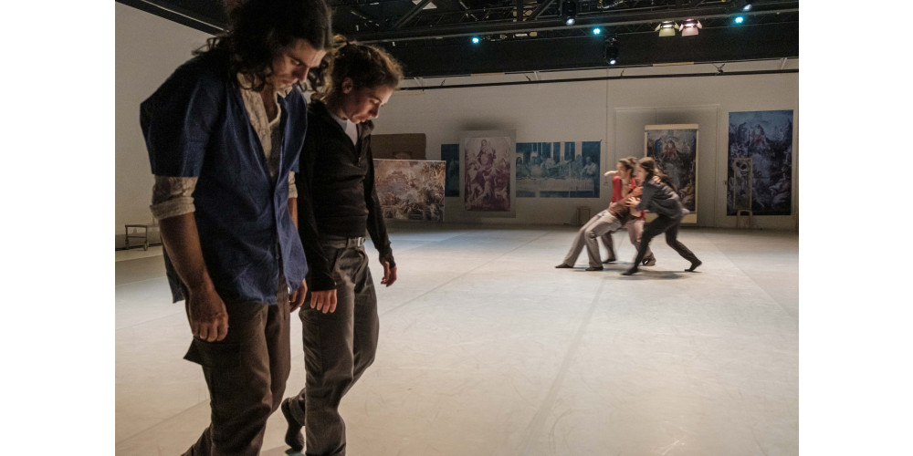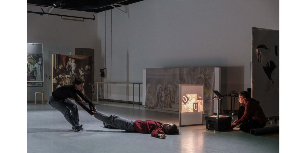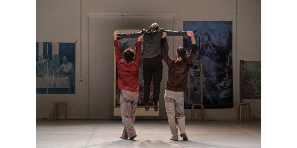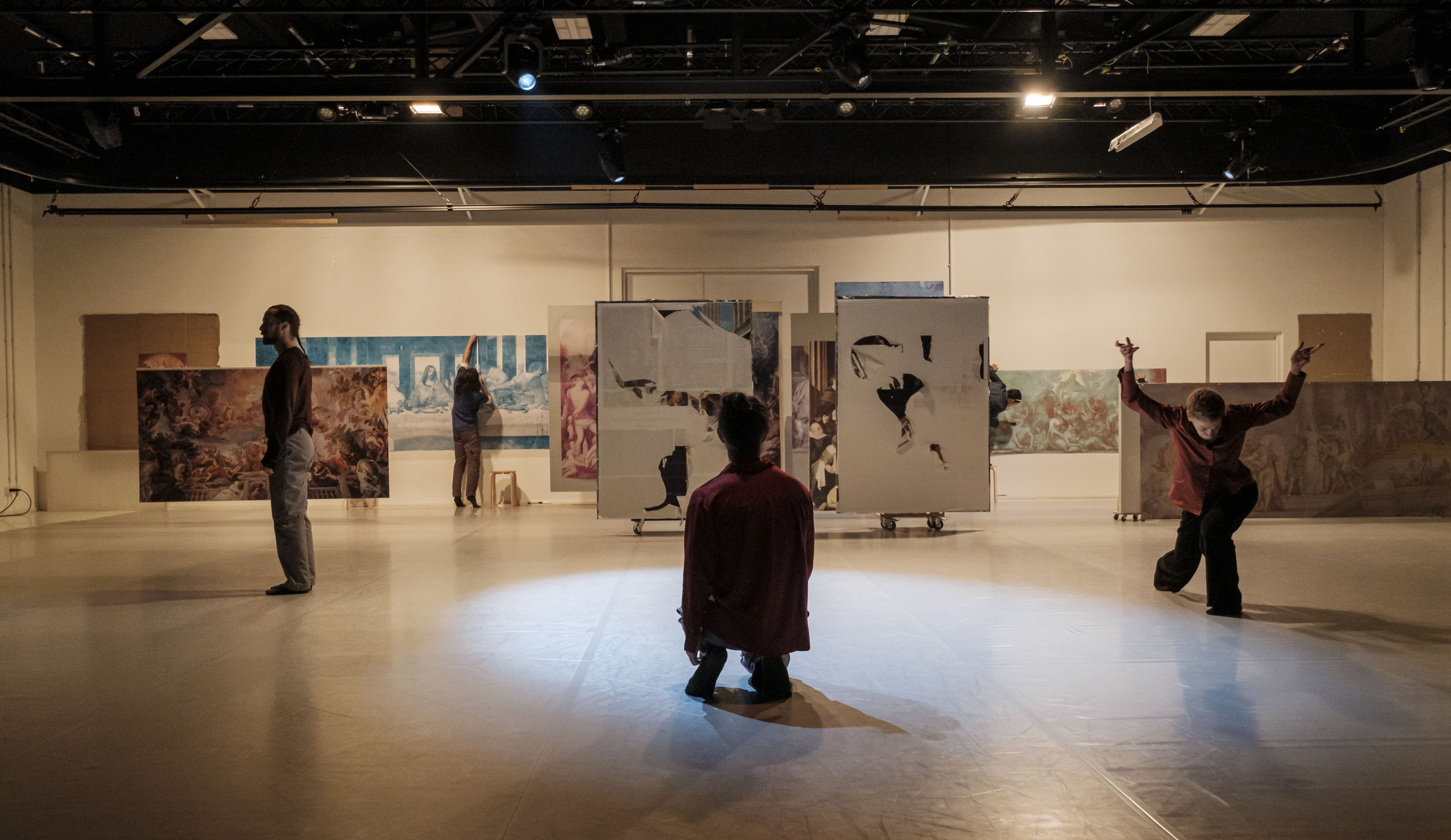 Dann pappen im Schwere Reiter verblichene Kopien alter Fresken oder barocker Altarbilder an der Wand. Weitere religiöse Schinken hängen mobil von der Decke. Es gibt fahrbare Steller mit Gemälden, die unter einer darüber aufgebrachten weißen und teilweise eingerissenen Schicht bloß noch zu erahnen sind. Das so zu Beginn noch eng kulissenartig ineinander gestaffelte Arrangement im Hintergrund wird nach und nach zum Schauplatz einer tänzerischen Reinkarnation. Die Zuschauenden nehmen auf Kissen Platz und dürfen eine Stunde lang zusehen, wie das geheimnisvolle Ambiente eines verlassenen Depots zum Leben erwacht, sich das Atelier in einen Studienraum verwandelt. Hier werden die Bilder immer wieder untersucht, um deren situativen Inhalten dann wiederum mit den Mitteln des zeitgenössischen Tanzes nachzuspüren.