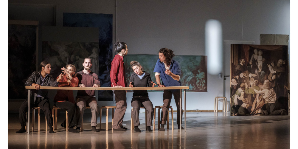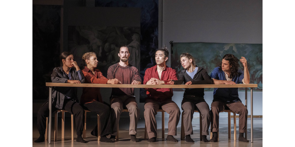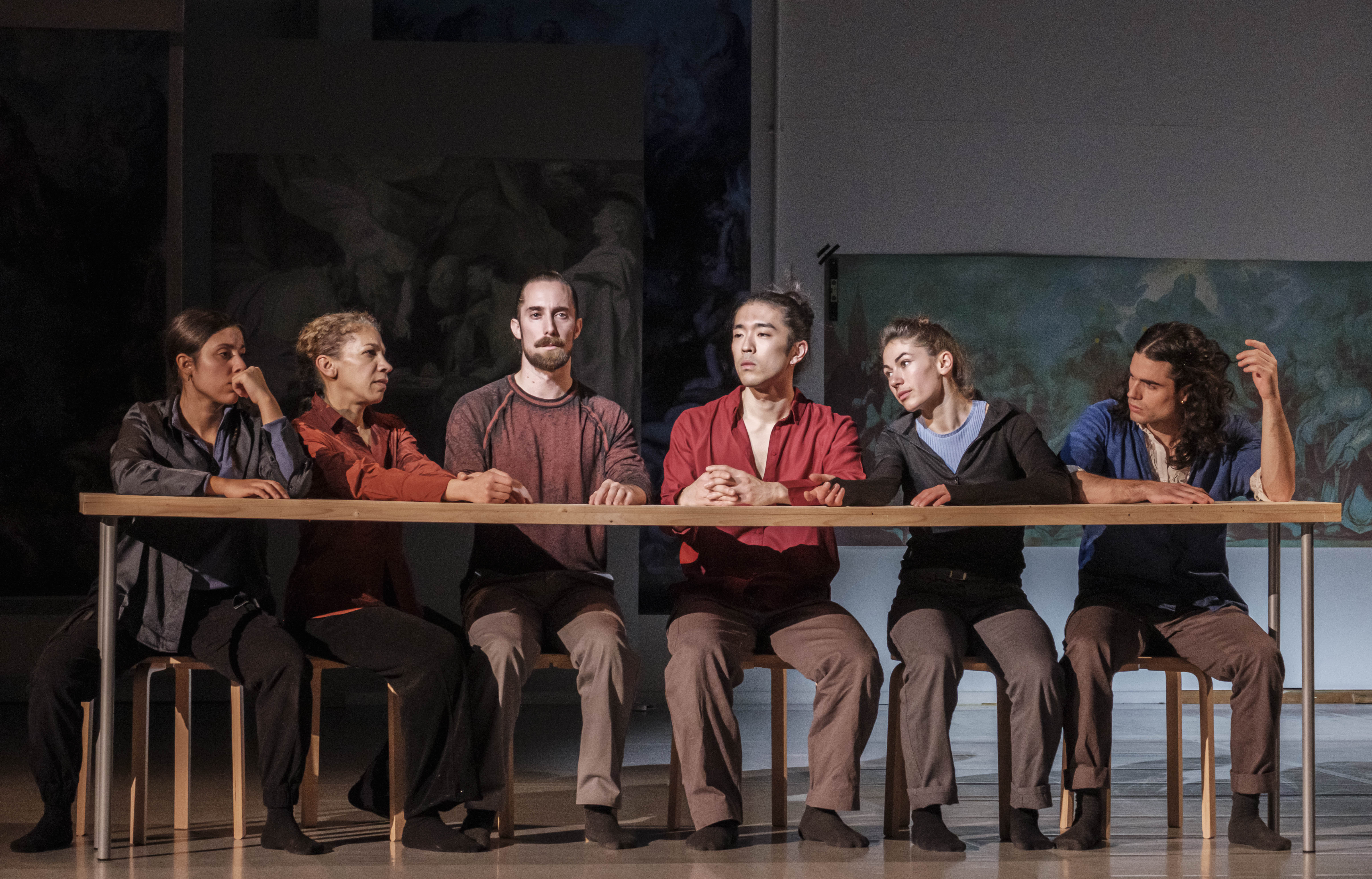 Im Gegensatz zur zeitgleich im HochX uraufgeführten Produktion „Muje“ mit live interagierender Musikerin und Lichtdesigner des südkoreanischen Duos Zinada fehlt Puruckers jüngster Kreation das Potenzial, Zuschauer musikalisch und/oder emotional vom Hocker zu reißen. Dafür weiß er durch akribische Recherchearbeit zu überzeugen, die seinen Interpret*innen regelrecht in Fleisch und Blut übergegangen ist. Rubens „Engelssturz“ und Leonardo da Vincis „Abendmahl“ sowie die Pietá spielen dabei eine wichtige Rolle. Indem Szenen daraus aufgegriffen werden, die sich inhaltlich langsam vor dem Auge des Betrachters verschieben und in ihrer Klarheit verschwimmen, wird das Publikum auf eine Art mentale Erfahrungsreise mitgenommen. Und die findet ihren Höhepunkt hinter einem langen schmalen Tisch.