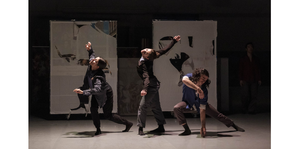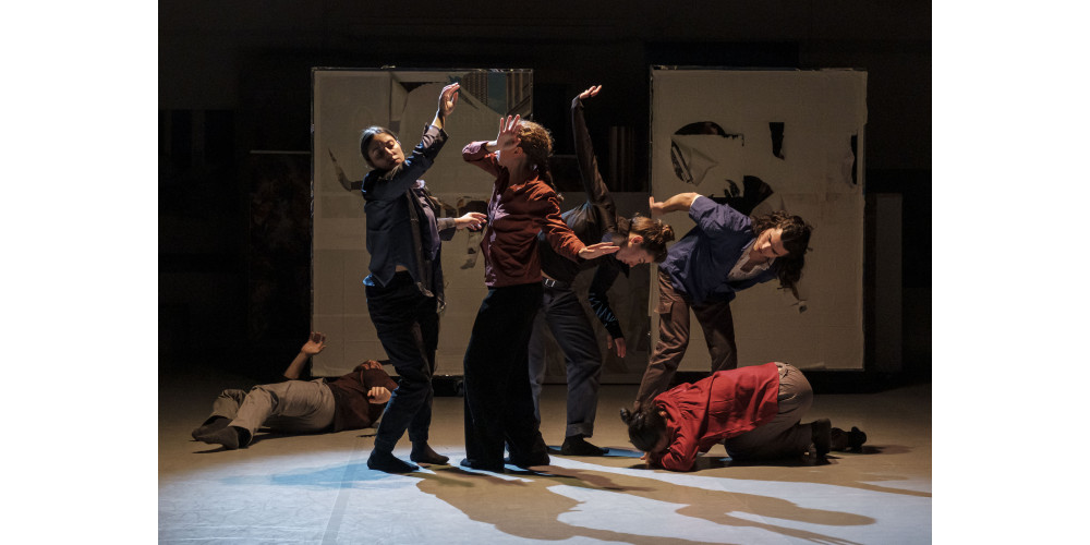Sechs Protagonist*innen, einen nach dem anderen, lässt Micha Purucker langsam durch die Mitte des Lagers und von den Seiten auftauchen. Ihre Bewegungen sind weich und fließend. Müsste man eine Richtung definieren, wäre dies ein Fallen von oben nach unten. Ein leiser sphärischer Klang füllt zuerst mit einem Windsäuseln, später mit weiteren, lärmigeren Geräuschen und sich überlagernden sakral anmutenden Musikpassagen (Sound: Robert Merdžo) den Raum. Wie die Akustik verändern sich bald auch die Lichtstimmungen (Michael Kunitsch). Aurora Bonetti, Michal Heriban, Marcos Nacar, Hikaru Osakabe, Anise Smith und Polina Sonis tasten sich mit behutsam flatternden Armen vor. Alle tanzen in sich hinein. Ihre Beine finden unter den sich um die eigene Achse windenden Körpern nur kurz etwas Stabilität, bevor sie weitergewirbelt werden.