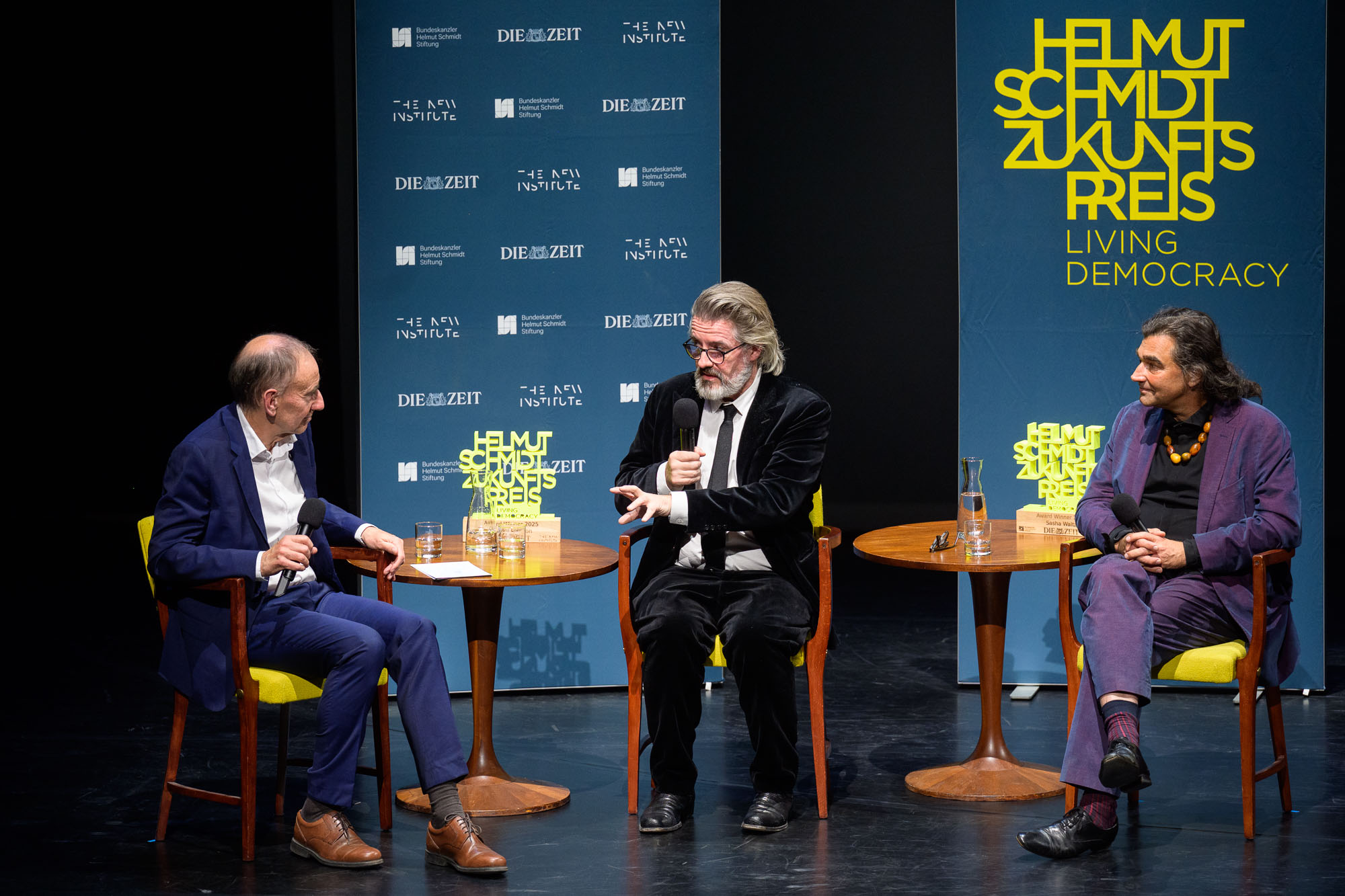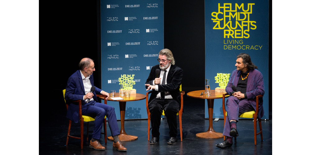 Die deutsche Tänzerin, Choreografin und Regisseurin Sasha Waltz und der dänisch-isländische bildende Künstler, Designer und Architekt Olafur Elíasson wurden am 25. Mai im Hamburger Thalia-Theater mit dem Helmut-Schmidt-Zukunftspreis ausgezeichnet. Verliehen wird der mit insgesamt 20.000 Euro dotierte Preis seit 2022 von der Helmut-Schmidt-Stiftung, der Wochenzeitung DIE ZEIT sowie dem NEW INSTITUTE an „eine internationale Persönlichkeit für ihre innovativen Leistungen in den Bereichen Demokratie, Gesellschaft und Technologie“.