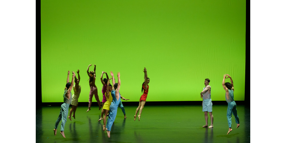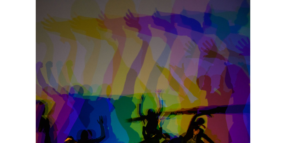 Wie ähnlich Olafur Elíasson arbeitet, wurde dann ganz am Schluss deutlich, als über seine am Bühnenrand aufgestellte Lichtinstallation „Your Pluralistic Coming Together“ die Konturen der noch einmal, nun improvisierend auftretenden Tänzer*innen vielfarbig auf die hintere Leinwand projiziert wurden – ein Objekt zum Staunen, das das Verbindende zwischen den Menschen augenfällig machte.