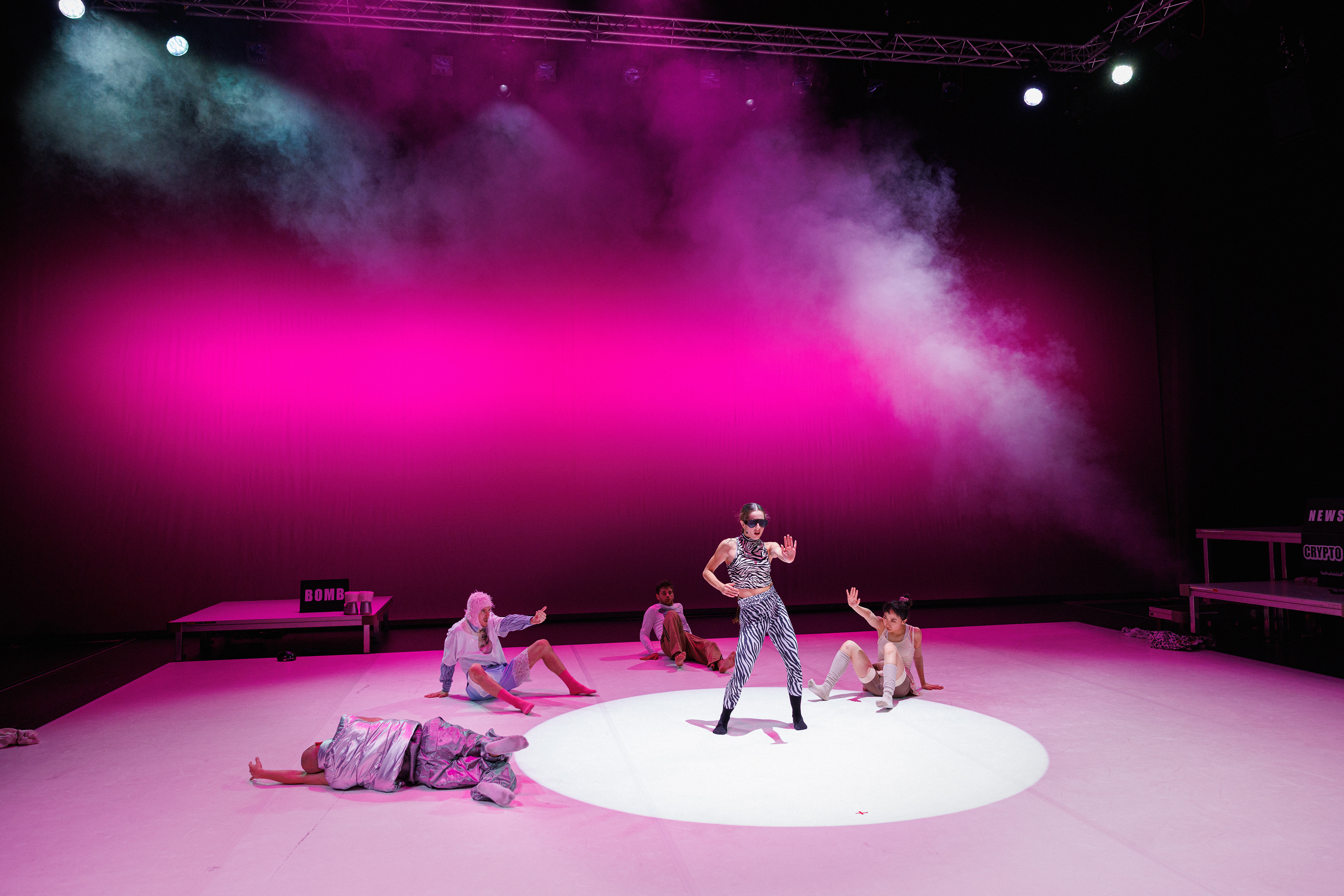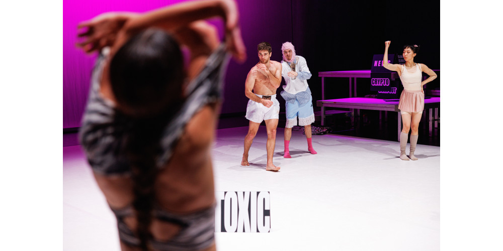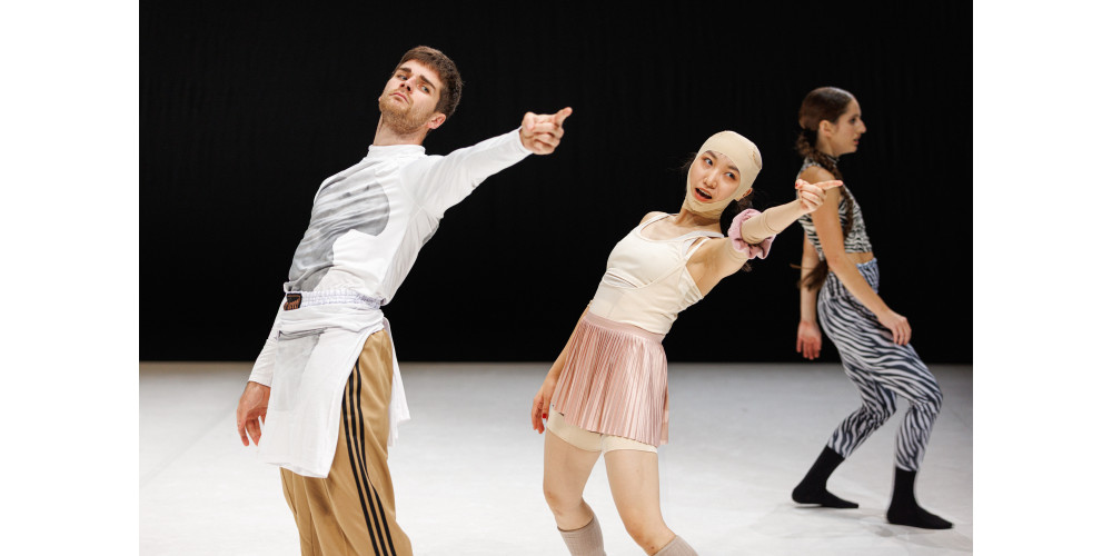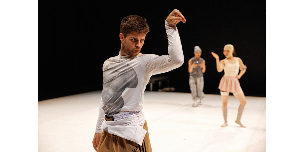 Die Tänzerinnen und Tänzer, komplettiert noch durch Niklas Capel, sind inzwischen ein eingespieltes Team. Alle haben schon in Arbeiten von Maria Chiara de Nobili und Alexander Miller getanzt. Die beiden Preisträger des diesjährigen Förderpreises der Landeshauptstadt Dresden tauchen in ihrer neuen Arbeit „Hype the Pain“ gemeinsam mit ihrem Cast genüsslich in den digitalen Wahnsinn, wie er sich „am schönsten“ auf TikTok zeigt. Gábor Halász ist mit seinen Sounds inzwischen im Team genauso eine feste Größe wie Geohwan Ju mit seinem Lichtdesign.