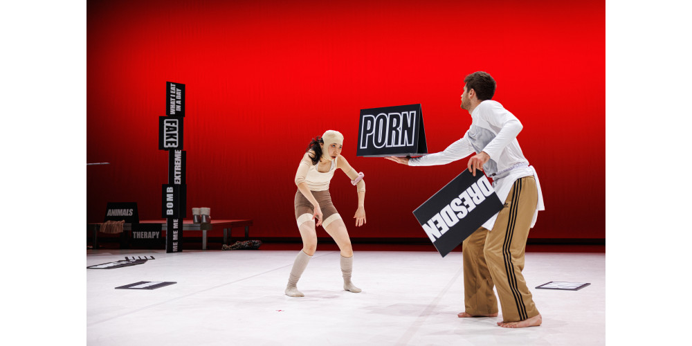 Um den Hype zu hypen „braucht“ es natürlich umfangreiches Tagging. Und so, wie hier die Clips der Selbstinszenierung aus dem digitalen Raum in die direkte Bewegung geholt werden, sind auch die Hashtags auf der Bühne: Zu dem Schild mit der Aufschrift „Mood“ kommen unzählige weitere. Panic. Trauma. Fail. Me Me Me. What I eat in a Day. Sale. Fake. Detox. POV. Share. WW3. Cringe. Porn. Allein schon diese Begriffe skizzieren die grenzenlose Vielfalt der repräsentierten Inhalte. Das Vorhandensein dieser Schilder im Raum unterstreicht dazu aber auch noch die so schon nicht zu bewältigende Informationsflut. Das menschliche Gehirn ist dafür schlichtweg nicht gemacht.