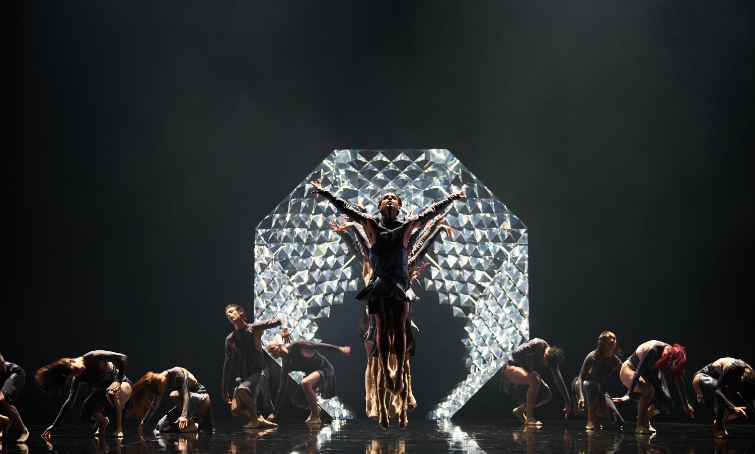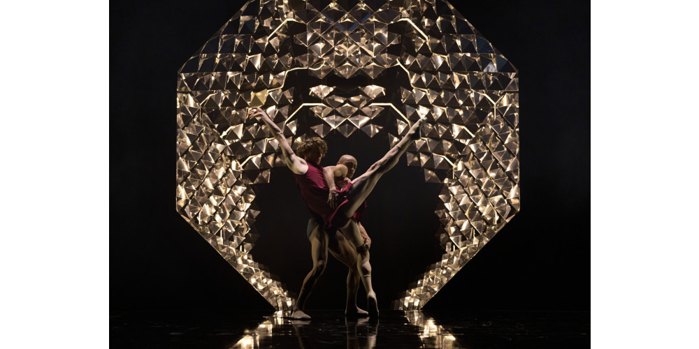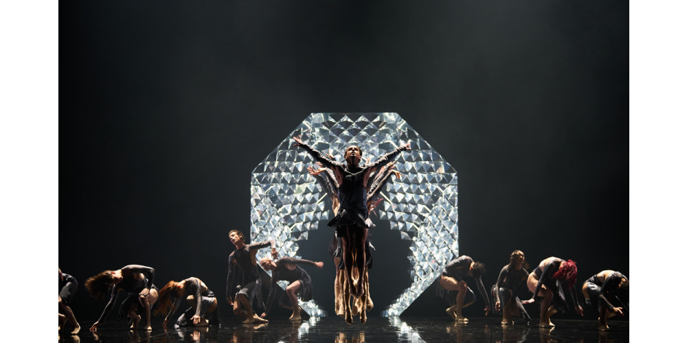 Bis die Sonne alles übernimmt. Wie ein Tor aus riesigen Kristallen dominiert sie die Bühne. Gebrochene Lichtstrahlen ziehen einzeln weit in den Saal. Ihre Faszination und Anziehungskraft ist aber ganz klar eine gefährliche. Die aus ihrem Inneren quellenden Tänzer*innen tragen mit ihren Kostümen das Grau von Asche. Ein unmissverständliches Menetekel. Weit über ihre Köpfe erheben sie Ikarus, bevor er wieder am Boden landet und, kopfüber, von seinem Vater in die gleiche Pose wie zu Anfang gebracht wird. Zum Schluss bleibt ihm nur noch ein wildes Solo, inmitten der Sonne. Losgelöst, befreit.