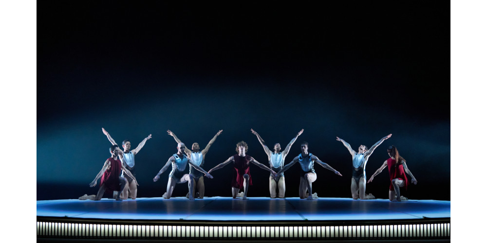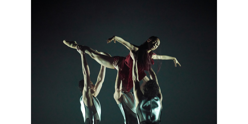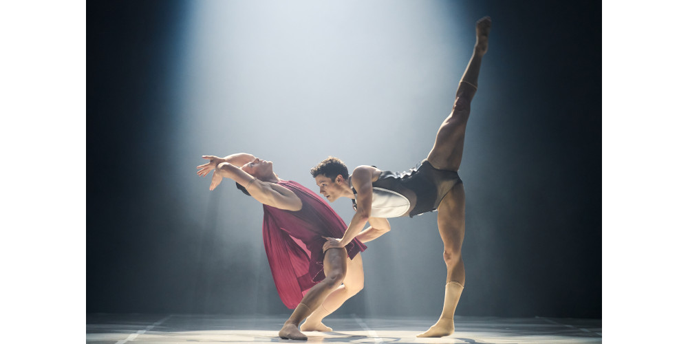 Was aber nicht bedeutet, beide wären eins. Ikarus trägt ein weich fließendes Kostüm in ruhig gesättigtem, dunklem Rotton; sein Vater dagegen steckt in einem silbrig-kalten, knappen Panzer. Symbolhaft spricht Kostümbildner Anastasios Sofroniou im Programmheft zum einen von verbrannter Haut (rot), zum anderen von einem Schutzschild, aber auch von Flugzeugen (silbern). Das wiederholt sich vielfach. Die anderen Tänzerinnen und Tänzer tragen jeweils eins dieser beiden Kostüme.