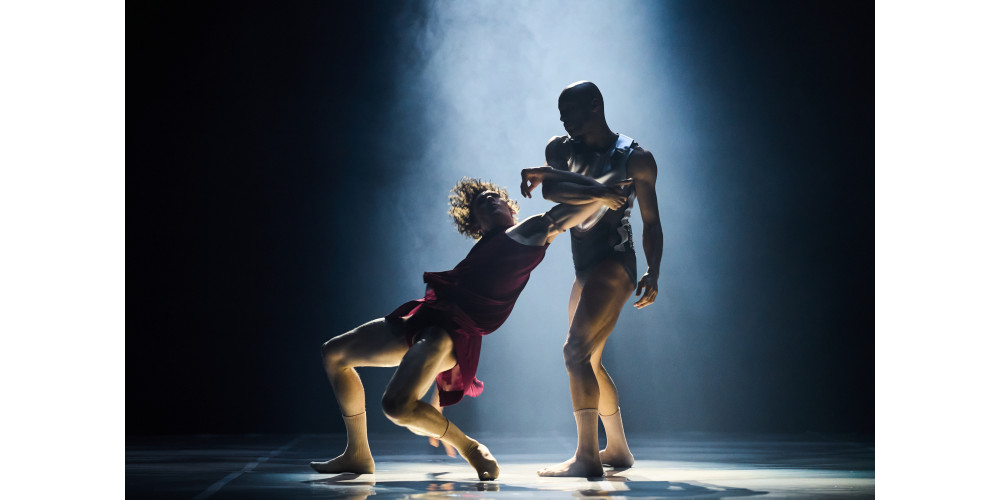 Deshalb beginnt alles noch mal von vorn. Der Gefallene kommt auf die Füße, gelangt an den Rand der runden, podestartigen Bühne. Um dort, breitbeinig, zwischen den Schenkeln, den eigentlichen Ikarus förmlich zu gebären. Floris Puts gibt diesen Neuankömmling erst noch mit unsicheren Schritten, ein Gurren schwirrt durch den Raum. Zu sicherem Stand verhilft ihm Jamal Uhlmann, Ikarus‘ Vater Daedalus. Er ist es auch, der den Sohn gleich zu Anfang mit einer Hebefigur in ein zentrales Bild setzt: Er hebt den Sohn vom Boden ab und verhilft ihm, wie in einer Variation des Pas de poisson, der Fischpose, kopfüber zum Fliegen, mit weit ausgebreiteten Armen.