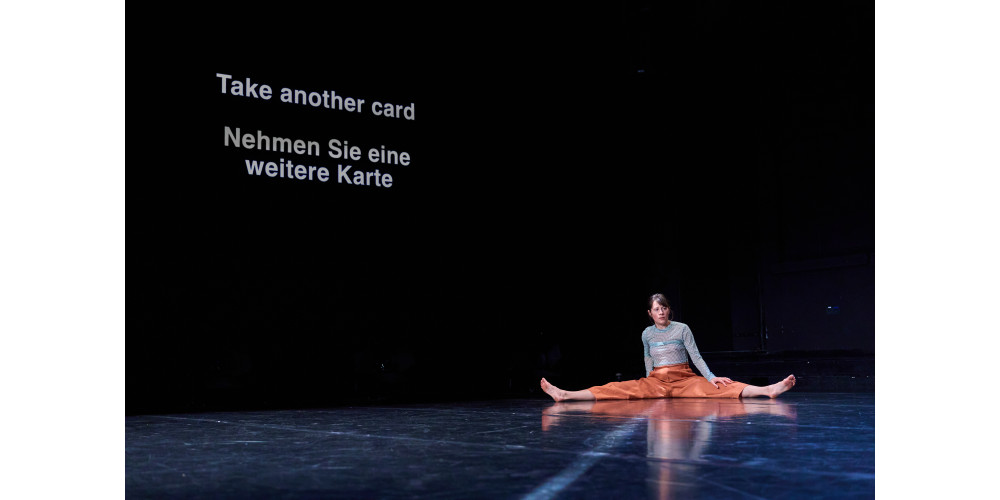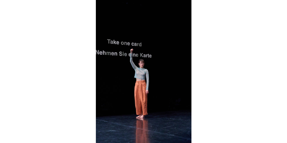 Mein Festivalbesuch beginnt mit der allerersten Vorstellung des Programms: „Parsley for garnish“ von Sasha Portyannikova. Ganz schnell merke ich: Ich habe keinen Ton zu dokumentieren. Denn die Performance bleibt über weite Strecken lautlos bis auf einige Toneinspielungen zum Schluss. Dennoch sind die Emotionen deutlich spürbar – sie entstehen einerseits aus den ruhigen, aber auch andererseits schlagartigen Bewegungen, der Klang ist hier im Körper verankert und nicht an äußerliche Geräusche oder Musik gebunden. Sprache ist präsent, aber auf eine stille Weise: Dem Publikum werden zu Beginn Karten mit Fragen zu Dilemmata von Migration, Fremdsein und Konflikten ausgeteilt. Innerlich mussten sich die Zuschauer*innen entscheiden, welchen Weg sie wählen würden bzw. ob sie sich dem Zwang beugen würden, etwa bei einer rechten Regierung oder einem Kriegsausbruch ihr Land zu verlassen. Das löst natürlich sehr ambivalente Gefühle aus. Und durch den intensiven Blickkontakt mit der Künstlerin entsteht das Gefühl, zugleich Beobachter*in und Beobachtete*r zu sein.