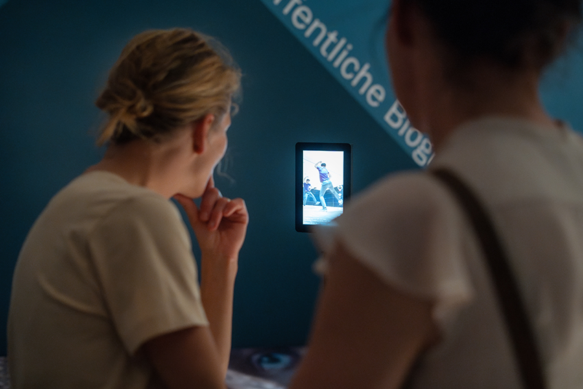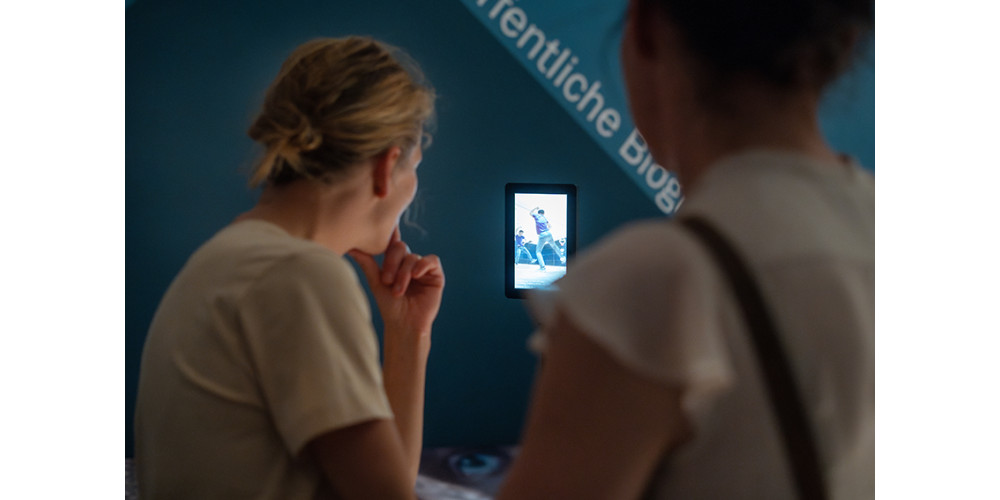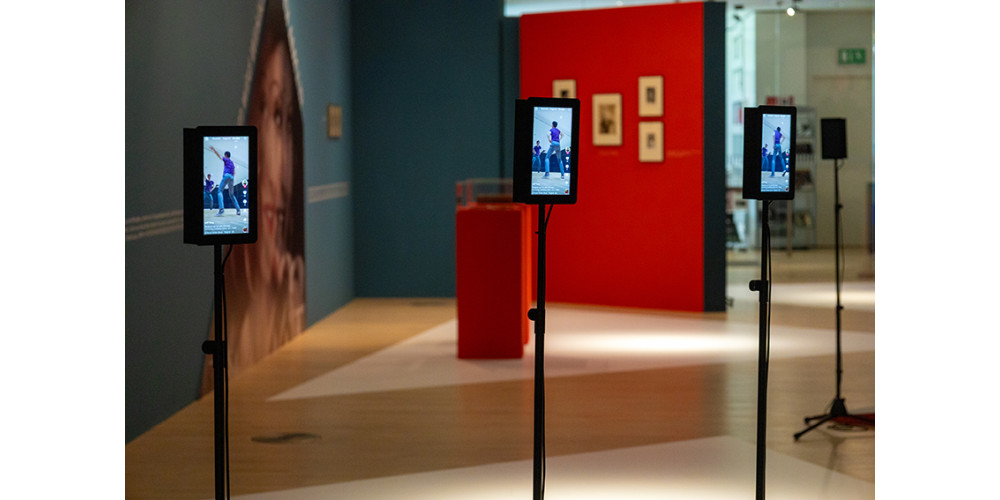Das Besondere ist dabei die clevere Präsentation: Hier sind keine großen Screens installiert. Alle Videos (bis auf den Film im hinteren Raum) werden auf smartphonegroßen Bildschirmen präsentiert. Das verbindet sich natürlich direkt mit dem TikTok-Hochkant-Format und kommentiert damit wortlos den Weg heute verbreiteter Selbstinszenierung via Tanz. Diese Videos sind aber nicht etwa überpräsent, wie oft im Alltag wahrgenommen. Die Displays sind so positioniert, dass erst auf dem Rückweg in Richtung Ausgang die Videos sichtbar werden.