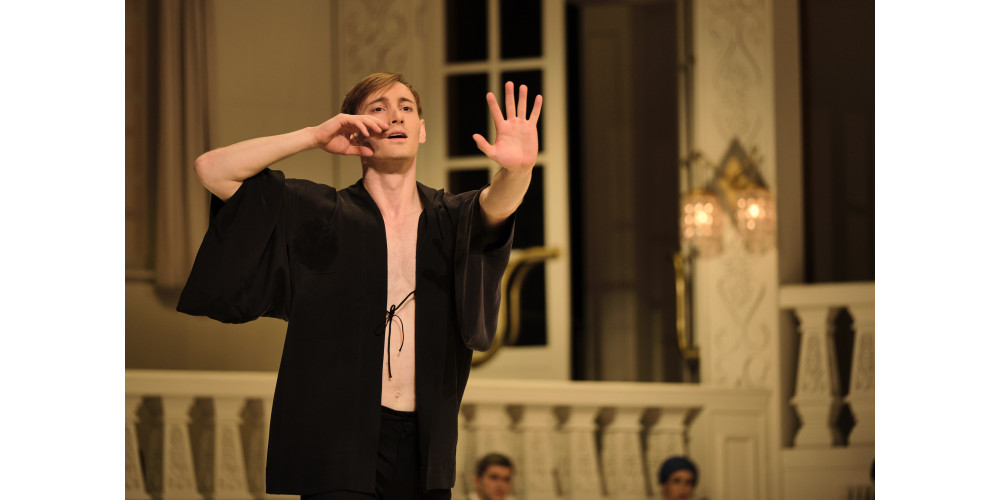 Immer wieder an seiner Seite, still ertragend und ihn gleichzeitig stützend, sieht man Nijinskys Frau Romola. Svetlana Gileva erinnert mit ihrer Sanftheit ein bisschen an Sanguen Lee als Lady Capulet in David Dawsons Version von „Romeo und Julia“. Man kann ihr förmlich das Gewicht auf ihren Schultern ansehen, durch das sie das Leiden ihres Mannes teilt. Das gilt eben auch für dessen Nähe zu Diaghilew. Richard House bietet hier Rogers einen ebenbürtigen Partner in jeder Hinsicht. Die intimen Szenen zwischen beiden überzeugen genauso mit ihrer Nähe, wie es die Zurückweisungen der Eifersucht schaffen.