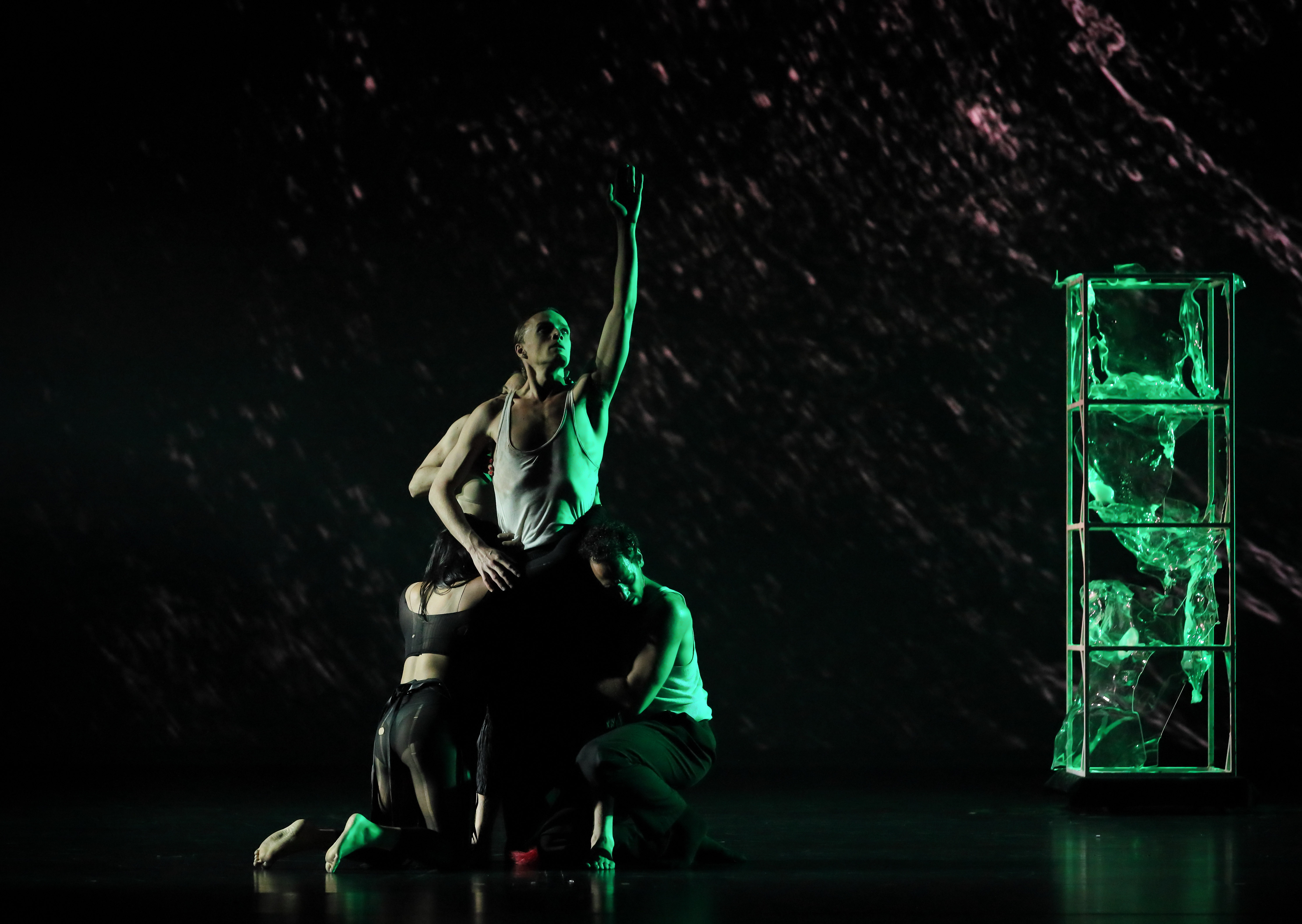 Der Rest des Abends ist von dunklen Farb- und Stimmungswelten wie auch einer niedergedrückten Bewegungssprache bestimmt, die sich vornehmlich am Boden abspielt. Auch wenn man Matthew Jared Perkos von der Faszination der Astrologie inspiriertes Stück „Traces of You and Us“ in seiner Aussage und der ins Geschehen integrierten bzw. über den Kopf gestülpten Papierplanen nicht zu folgen vermag, überzeugt die Choreografie vor allem aufgrund des physisch überaus starken Trios (Ethan Ribeiro, David Valencia, Emily Yetta Wohl). Diese stellt in teils fließend-lyrischer Bewegungssprache eine Hommage an den choreografischen Großmeister William Forsythe dar, dessen Improvisationstechnologien Ausgangspunkt der Findung des Bewegungsmaterials waren.