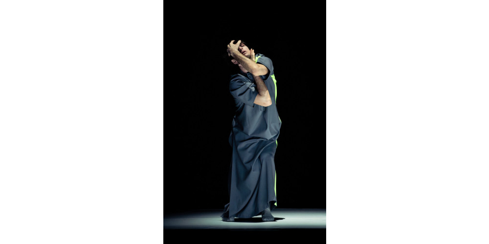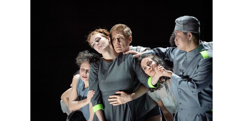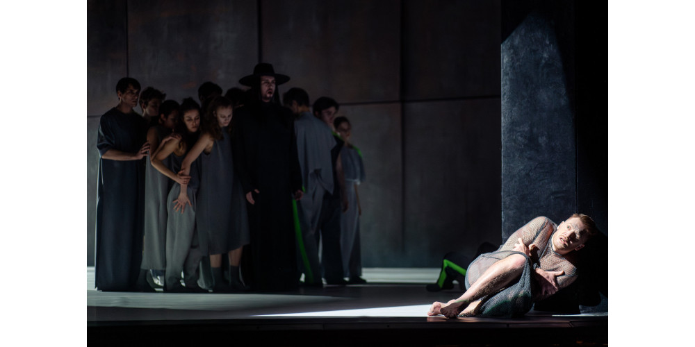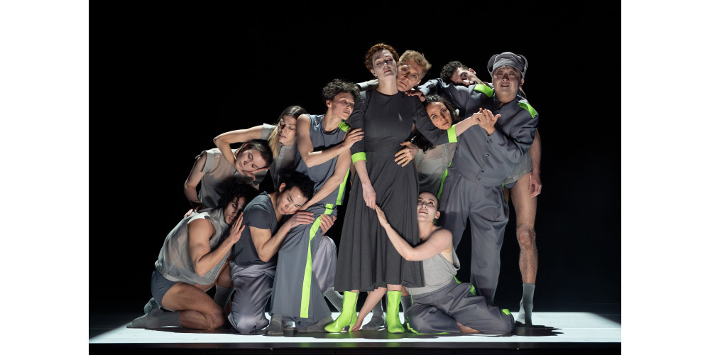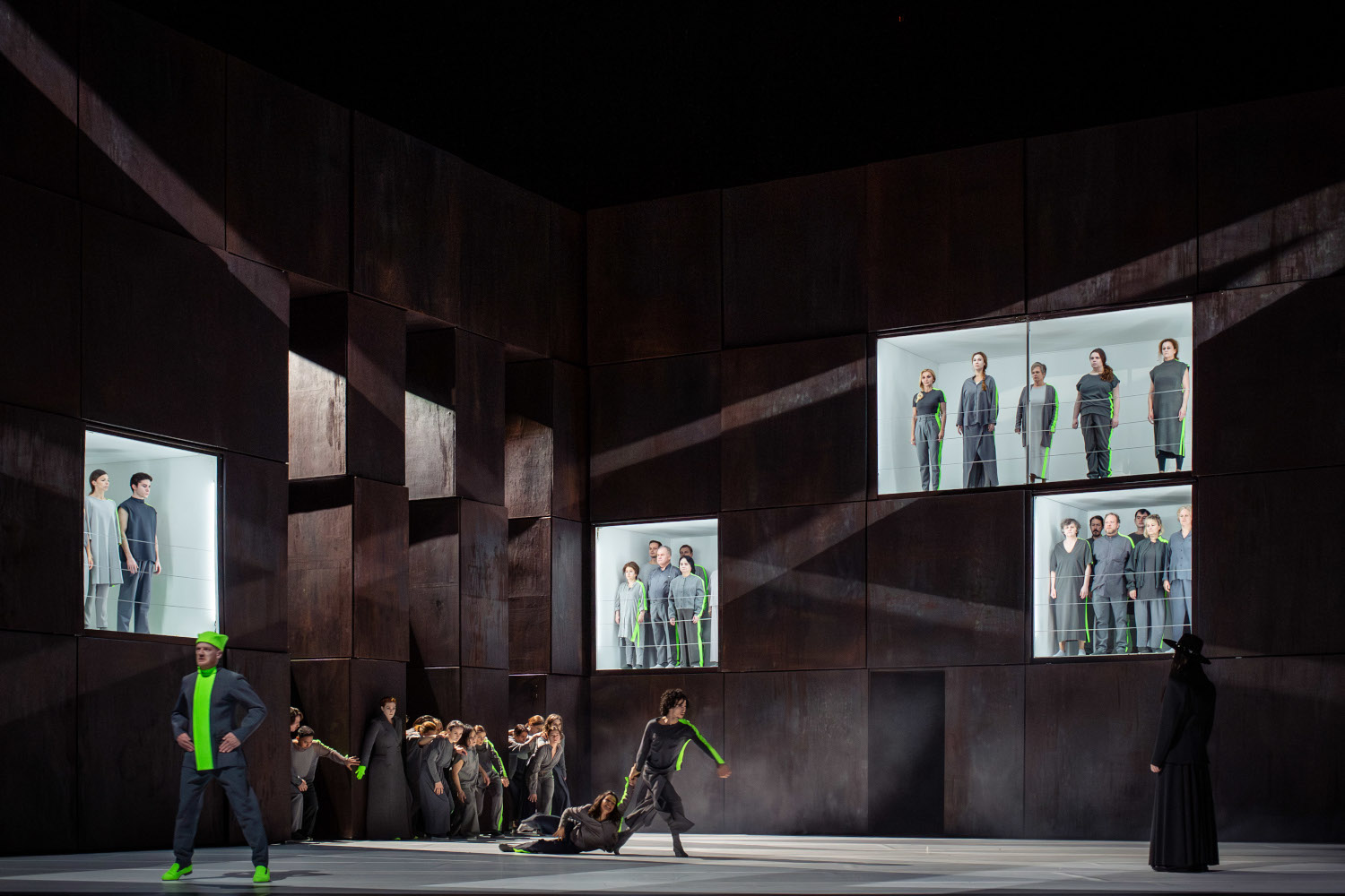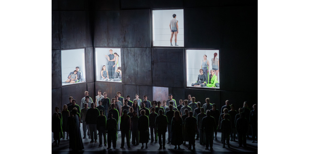 Die teilweise androgyn wirkenden Kostüme von Sascha Thomsen sind in unterschiedlichen Grautönen mit neongrünen Akzenten gehalten, einzig der Tod ist komplett in Schwarz gekleidet, sein tänzerisches Alter Ego allerdings nicht. Allgemein ist der Bezug zwischen den Sänger*innen und Tänzer*innen mehr am Besetzungszettel als auf der Bühne zu erkennen. Thomsen begrenzt den Bühnenraum mit zwei fensterlosen Wänden aus riesigen Kuben, die teilweise geöffnet und so als kleine Bühnen eingesetzt werden können. Ein klarer Bezug zu Kaiser Overall, der im Laufe des Stückes die Textzeile „Ich habe mich mit fensterlosen Mauern umgeben“ singt. Schade, dass die Soundinstallation von Kian Jazdi den wichtigen Text des Prologs und auch zwischendurch Textteile sehr unverständlich werden lässt.