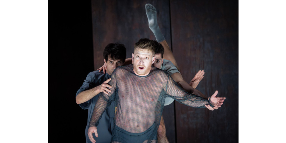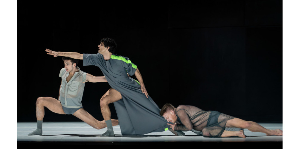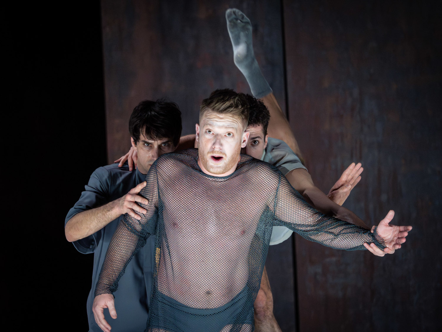 Dafür übernehmen die Tänzer*innen immer wieder Textteile, die im Libretto dem Lautsprecher zugeordnet sind. Der Tänzer Alexander Orlić hat als „Spital 34“ eine größere Sprechrolle, für welche Heise Text mit Bewegung verknüpft. Hervorzuheben ist, dass alle Tänzer*innen stimmlich gut geschult sind und sehr verständlich sprechen. Warum allerdings Orlić wie manche Tänzer Spitzenschuhe tragen muss, erschließt sich nicht. Auch wenn sie die Herausforderung gut meistern, so sieht man doch den Unterschied zu ihren Kolleginnen, die den Spitzenschuh seit Jahren gewöhnt sind. Verwendet wird ein neu entwickeltes modulares Spitzenschuhmodell, das in den sozialen Medien von Tänzer*innen sehr unterschiedlich rezensiert wird. Die Tänzer Gabriele Aime als Kaiser Overall und Martin Winter als Der Tod faszinieren mit ihrer ausdrucksstarken Bewegungsqualität. Allgemein ist die gute tänzerische Qualität an diesem Abend hervorzuheben.