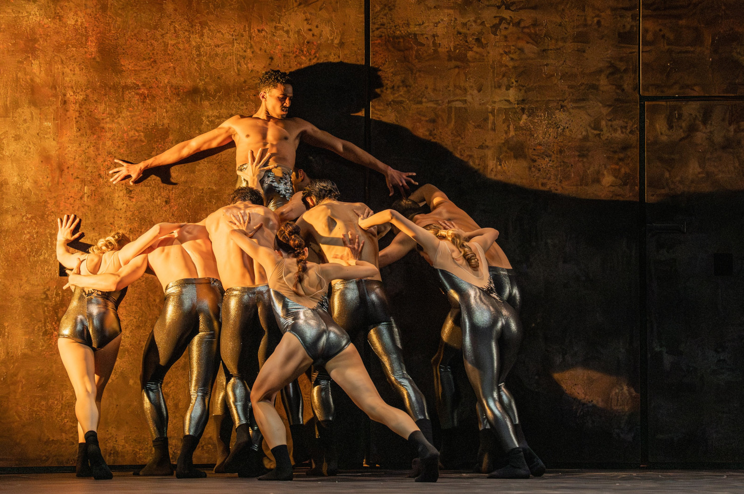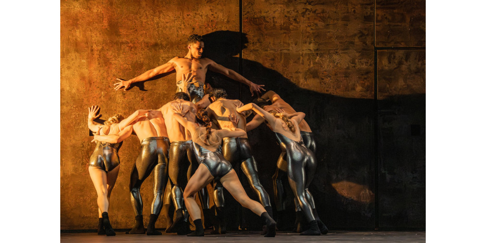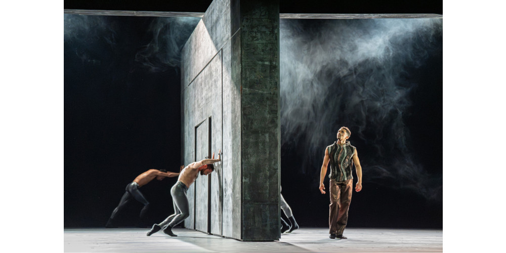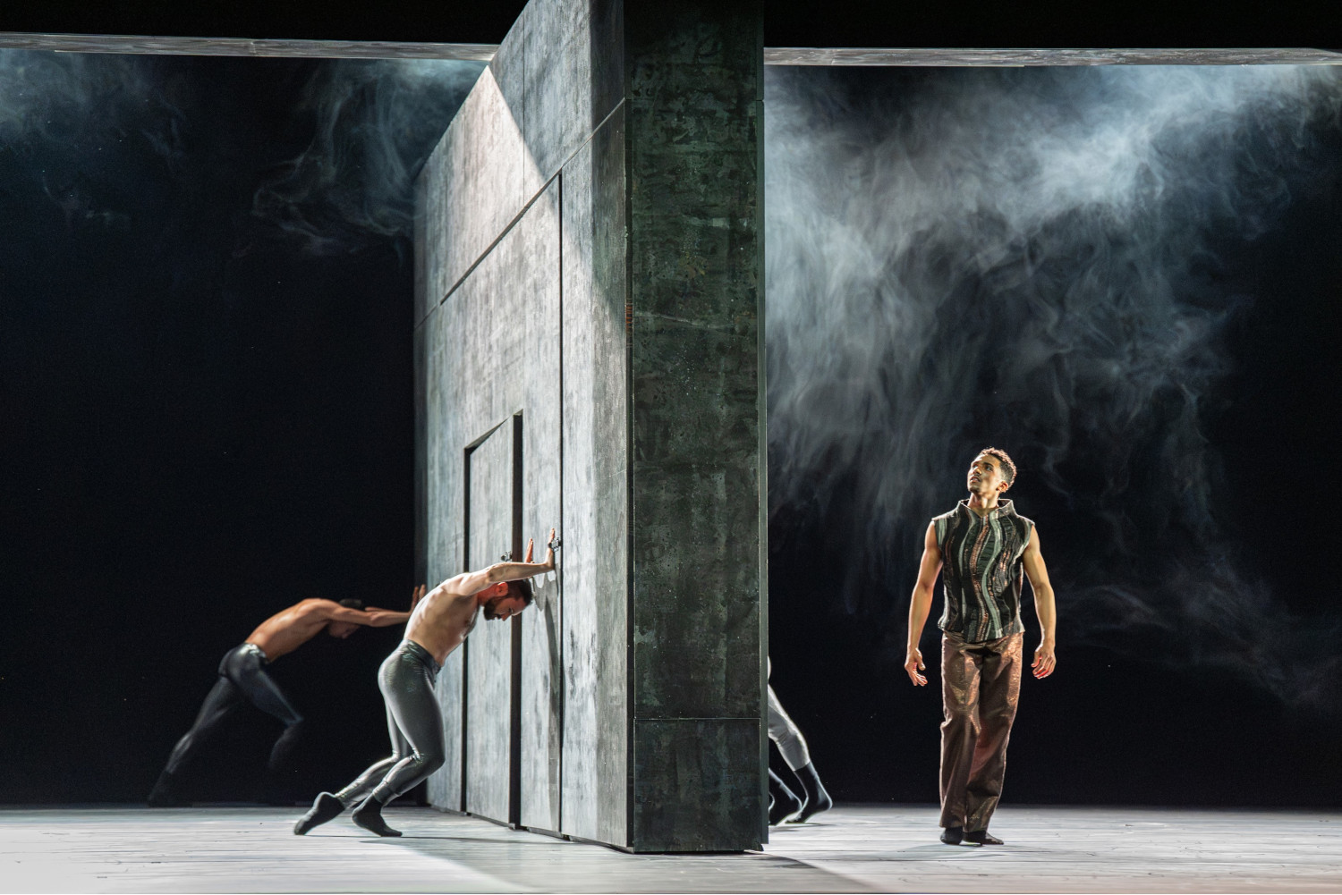 Die Uraufführung von „Moto Perpetuo“ reißt das Publikum gleich als erstes zu einem mittleren Begeisterungssturm hin. Das überrascht nicht, liegt allerdings weniger an der Choreografie oder den Tänzer*innen. Der eindeutige Star dieser Arbeit von Iratxe Ansa und Igor Bacovich ist nämlich ganz klar das berückende Bühnenbild von Curt Allen Wilmer und Leticia Gañán. Was zunächst nur wie eine verschlossene Wand wirkt, vor der Márcio Mota hilflos wie einsam sich selbst überlassen ist, entpuppt sich als eine Art Tor im Tor im Tor. Die Wand lässt sich in drei in sich verschachtelte Elemente öffnen, die sich alle um eine gemeinsame Achse drehen lassen. Die Konstellationen und Positionierungen, unter gekonntem Einsatz von Licht, zaubern eine sich ständig verändernde Raumsituation. Offiziell kam die Inspiration dafür von den rostigen Großplastiken Richard Serras, aber das ist für die grandiose Wirkung nebensächlich.