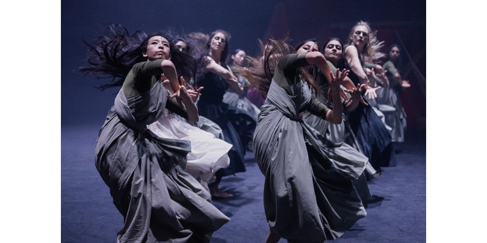 Sehr düster ist Akram Khans „Thikra: Night of Remembering”, ein Auftragswerk von Wadi AlFann: The Valley of Arts, al-'Ula, geworden. Ursprünglich als Open-Air-Produktion kreiert, hat Manal AlDowayan (Visuelle Leitung, Kostüm und Szenografie) den Ort für die Theaterfassung nachempfunden. Zu sehen ist eine Wüstenlandschaft mit Felsen, das Licht von Zeynep Kepekli setzt nur wenige Akzente auf der Bühne, das Geschehen findet meist im Halbdunkel statt. Die Matriarchin, in Rot gekleidet, kehrt für eine Nacht zu ihrem Stamm zurück. Gemeinsam mit zwei schwarz gekleideten Tänzerinnen führt sie ritualhafte Handlungen durch. Eine Tänzerin in weißem Kleid wird ausgewählt – ob sie zum Schluss auch geopfert wird, bleibt offen. Dazu kommen noch neun Tänzerinnen in grauen Kleidern.