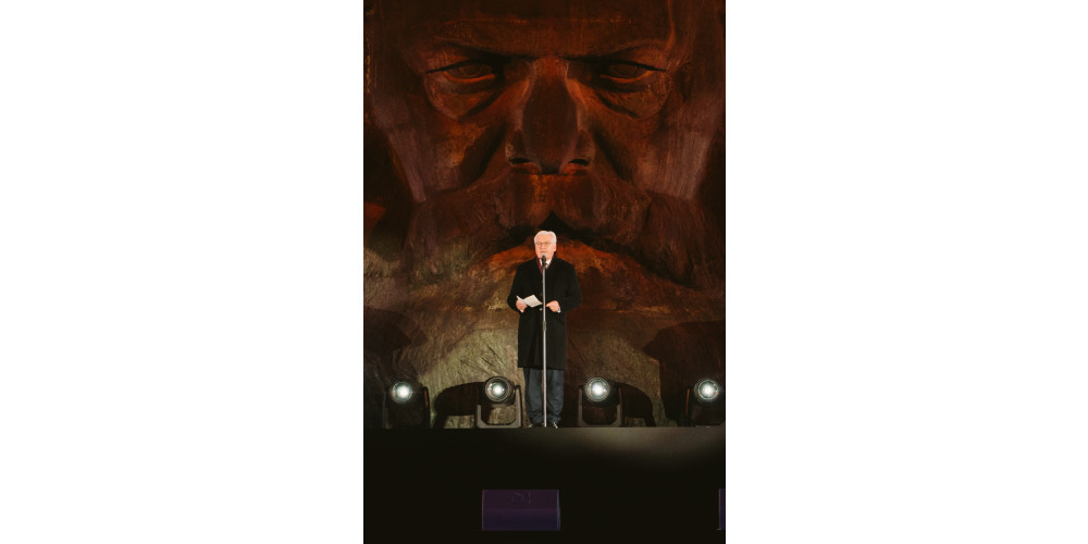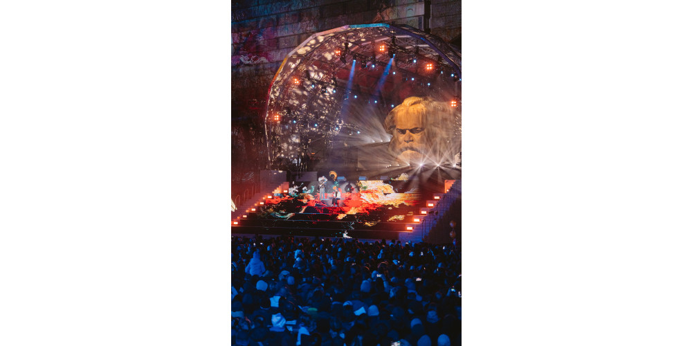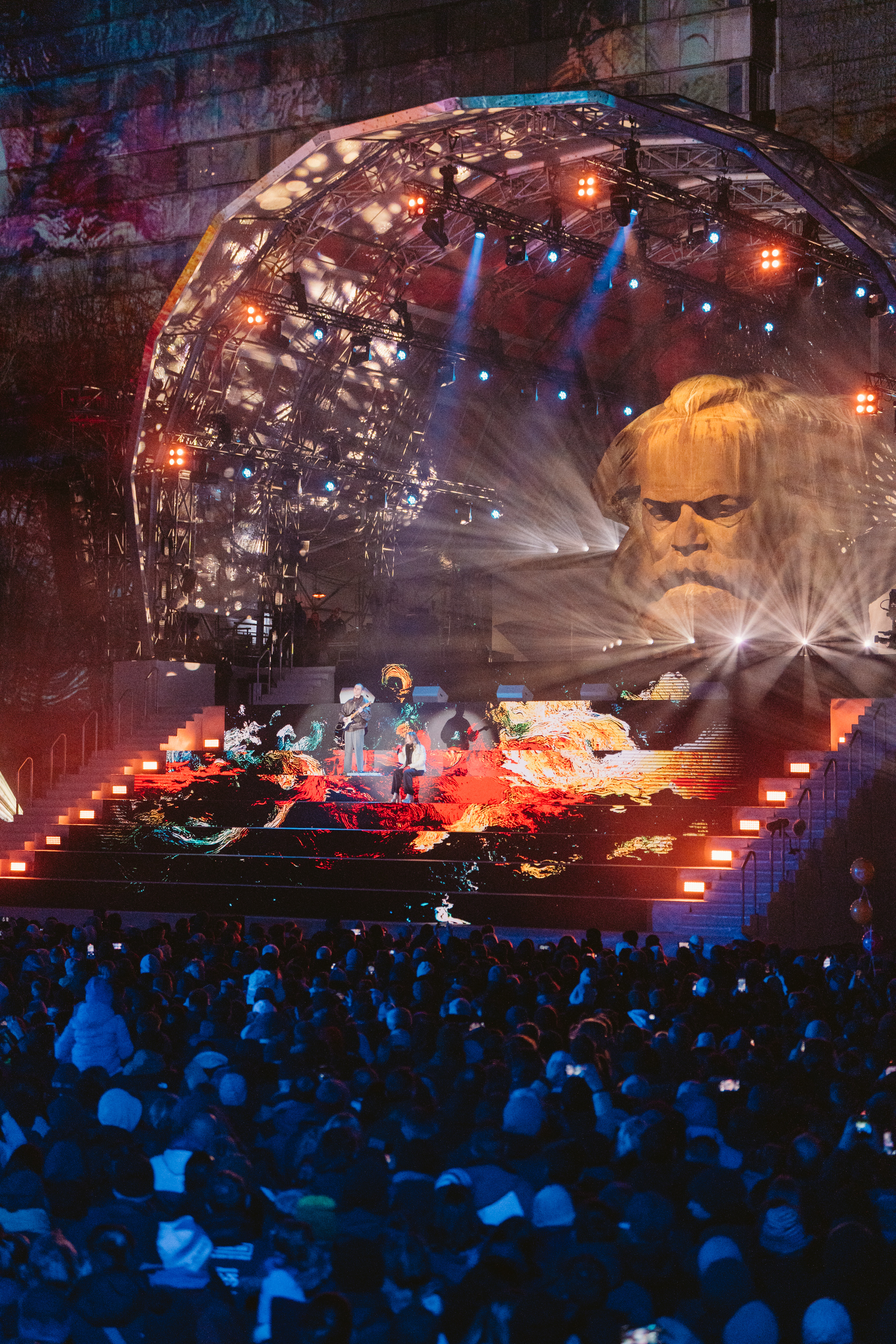 Daran schloss die große Eröffnungshow an, in Szene gesetzt von Lars-Ole Walburg. Mit einem von Theo Nabicht komponierten Bläserarrangement, das sich von Hochhausdächern sphärisch in den Himmel über Chemnitz schraubt, startet das Programm. Bühnenbildner Robert Schweer hat das für Chemnitz ikonische Karl-Marx-Monument mitten in die Bühne integriert, die von der Licht- und Videoinstallation von Timo Martens eindrucksvoll umspielt wird (Design und Gestaltung: Maria Walter).