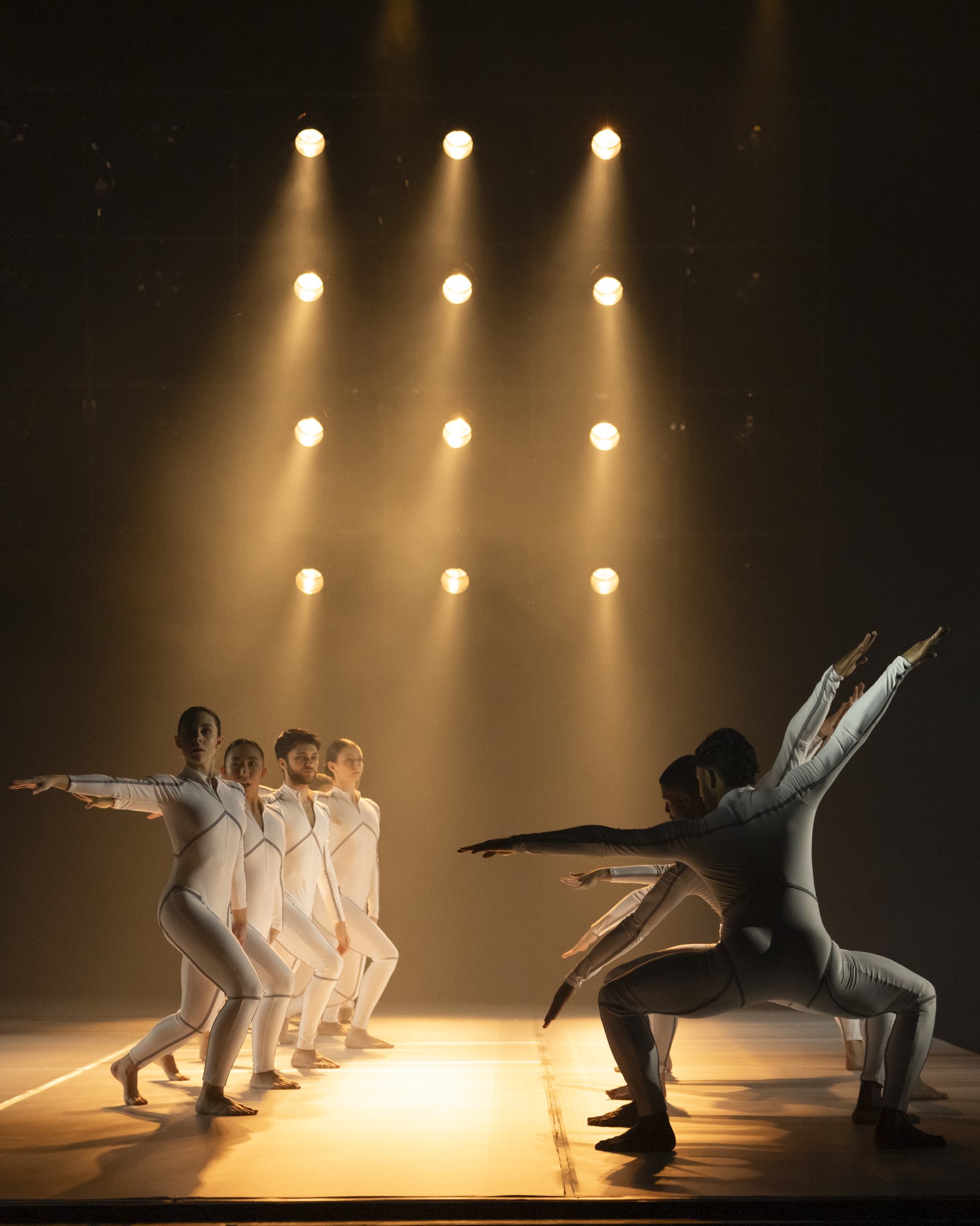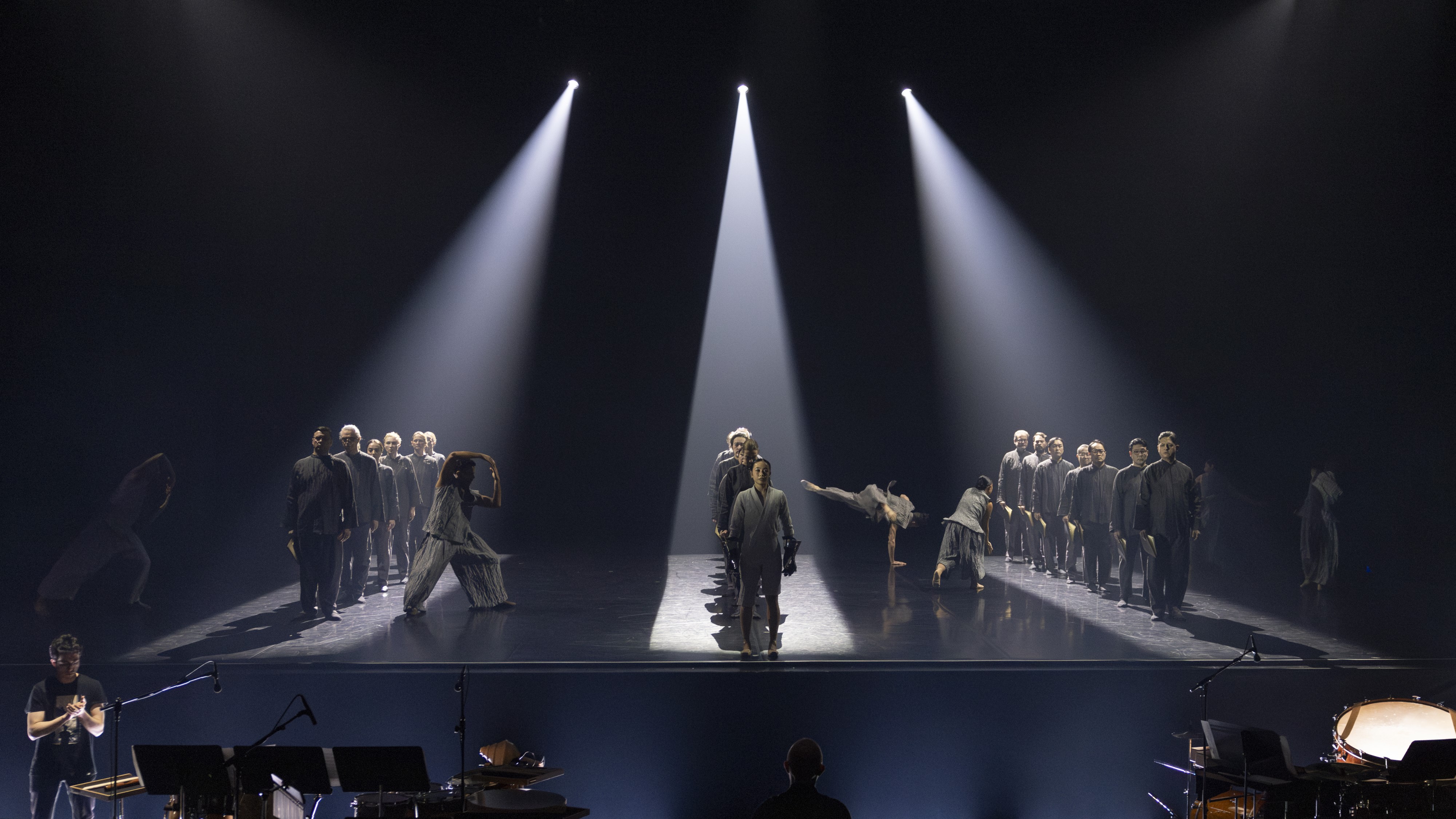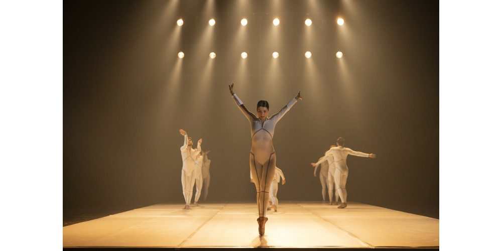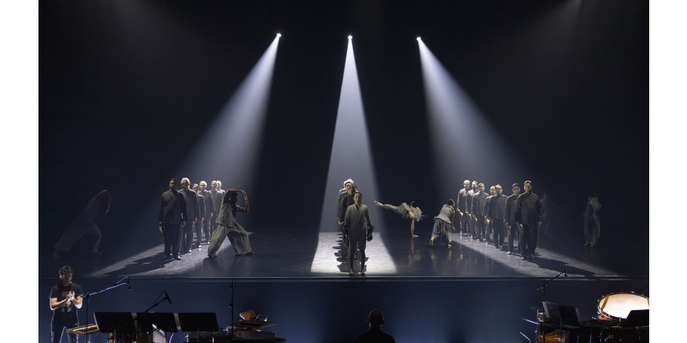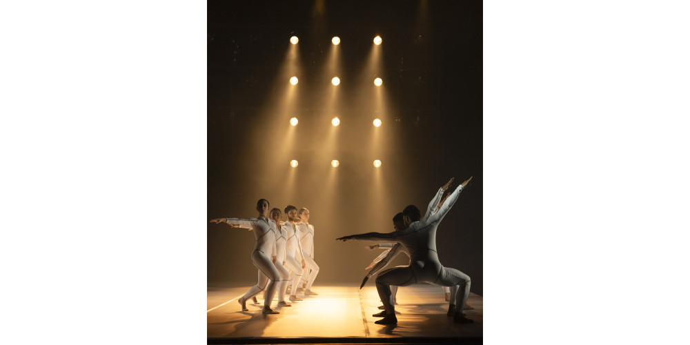 Schließlich ändert sich das Bühnenbild. Die vorherrschende Düsternis der historischen Zeit weicht. Eine helle Tanzfläche wird wie ein Teppich ausgerollt und von hinten mit gewaltigen Scheinwerfern angestrahlt. Doch statt der lichten Freiheit und Selbstfindung zwingt das Schlagwerk mit gewaltigen Schlägen die Tänzer*innen des Ensembles in den Gleichschritt. Wie Figuren einer Spieluhr drehen sie sich unter fremdem Kommando, das ihnen „eins, zwei, drei, vier“ vorschreit. Ihm entgeht nur die Figur der Jeanne, gedoppelt in Mann und Frau, während der Chor mit düsteren Gesängen über die Vergänglichkeit allen Seins an die Rampe tritt.