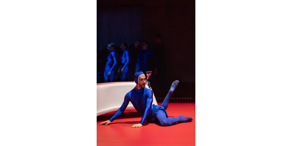 Zu Beginn schickt Alfonso López González die Tänzerin Kako Kijima zu einem psychischen Ego-Horror-Trip ins Badezimmer. Schon deren Blick in den Spiegel über dem Waschbecken im Hintergrund verrät Niedergeschlagenheit gekoppelt mit innerem Aufruhr. Ihr Versuch, Ruhe zu finden, gleicht einer Schlingerfahrt durch Stürme und Flauten. Getuschel und Geflüster erfüllt den Raum. Das Dröhnen im eigenen Kopf inszeniert González tänzerisch vortrefflich. Als die Tänzerin zum Sound einer launigen Jazztrompete in die auf dem rot beleuchteten Tanzboden stehende Wanne steigen will, formieren sich sogleich ganz in blaue Trikots mit Badehauben gekleidete Wesen schier wasserstrahlartig zu einem gallertartigen Mehrfach-Gegenüber. Dieses schwappt bald mit in die Wanne und kippt diese später mitsamt der darin Badenden um. Die Interpretin, von der Gruppe umspült, wird mal zärtlich gerahmt oder mit krallenden Händen stumm angebrüllt, was das Chaos guter und schlechter Gedanken in Kopf sehr anschaulich in all seinen schnell wechselnden Schattierungen widerspiegelt.
