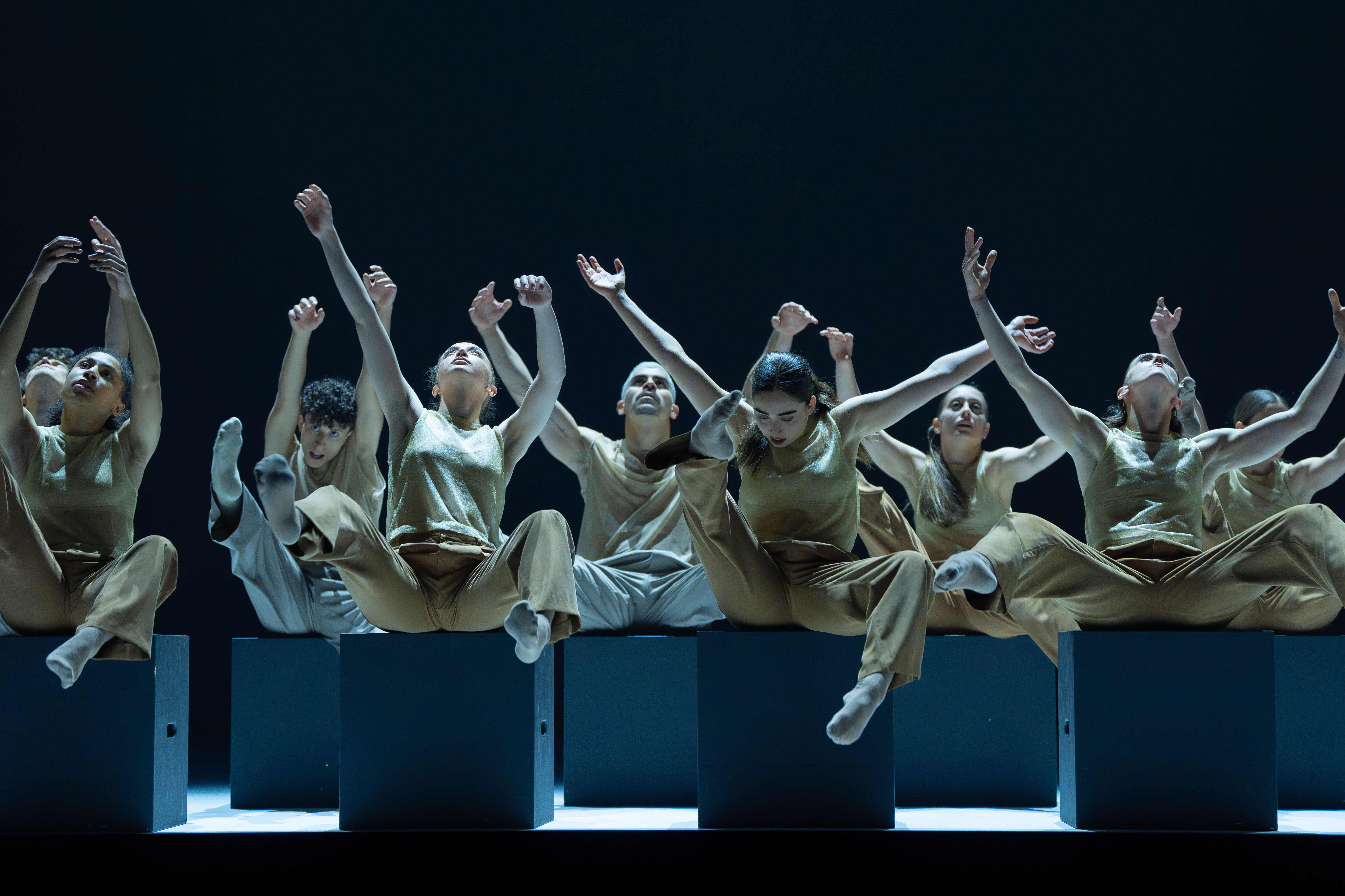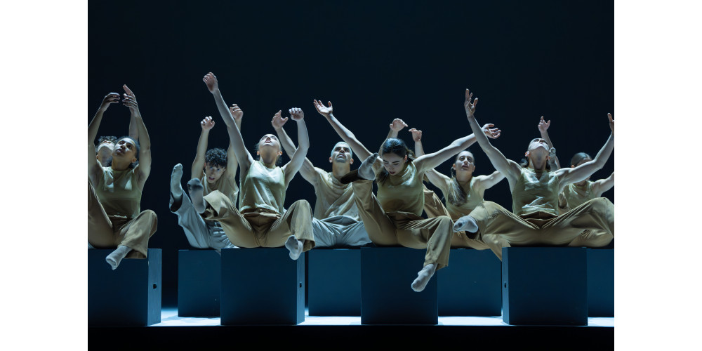 Mal bündelt eine große Gruppe mit ausgreifenden Armschwüngen die gesamte Energie. Dann wieder verteilt sich diese auf sich scheinbar zufällig in die Arme fallende Paare und ungewöhnliche Duette. Später kommen schwarze Boxen ins Spiel. Im Hintergrund gestapelt erinnern sie an eine Stadtsilhouette voller Hochhäuser in weiter Ferne. Vorne im Rampenlicht – platziert in zwei Reihen – werden Hocker in Würfelform und dazwischen eine Straße daraus. Die Protagonist*innen setzen sich, beugen sich vor, sacken gelangweilt in sich zusammen, und wippen dramatisch. Ein Bumpern erklingt. Die Kuben werden verstaut, der Raum nach hinten geöffnet. Vier in ihrer Bewegungsqualität unterschiedliche Gruppen flirren über die Bühne. Immer schnellere Beats treiben die Choreografie an. Die Lichtstimmung wechselt zu Rot. Ein Teil des Ensembles prescht bis auf den überbauten Orchestergraben vor. Noch eine geschwinde Drehung um die eigene Achse, dann bricht „Artefact“ jäh ab.