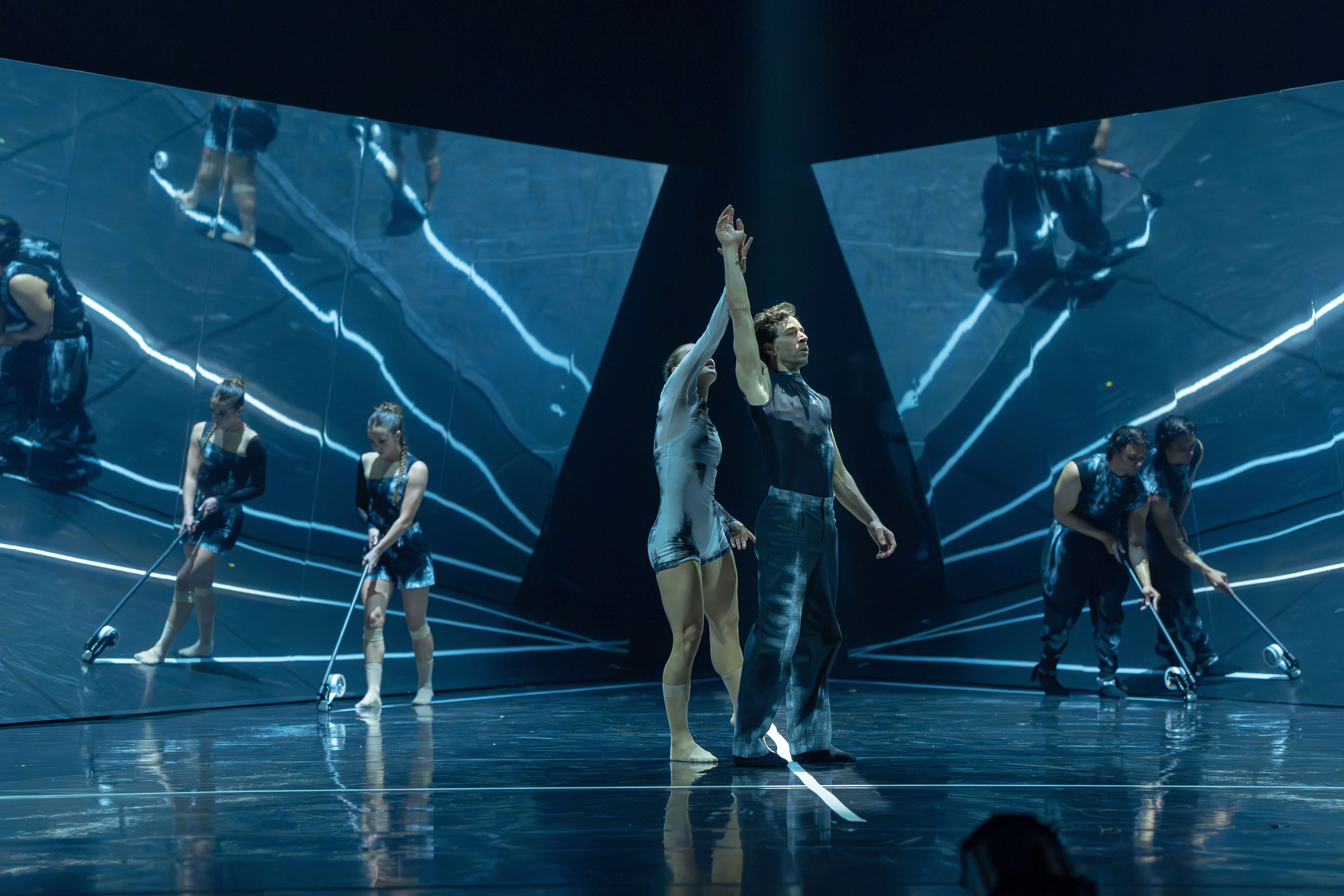 Zum Schluss des Abends sorgt die ebenso gruppen- wie strukturstarke Uraufführung „Artefact“ von Stephanie Lake (nicht zu verwechseln mit Forsythes „Artifact“ aus dem Jahr 1984) für einen Rausschmeißer der Extraklasse. Die Choreografin und Leiterin einer eigenen, in Melbourne beheimateten Kompanie wurde in Kanada geboren und wuchs in Tasmanien auf. Seit 2024 ist Lake Hauschoreografin des Australian Ballet.