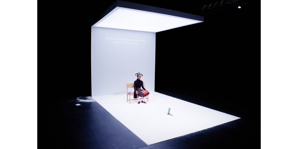 Mackenzy Bergile verarbeitet in seinem Stück seine eigene Familiengeschichte. Haiti, so sagt er im Publikumsgespräch nach der Vorführung, ist ein Schmelztiegel, in dem sich die indigene Bevölkerung mit den aus Afrika deportierten Sklaven und den französischen Kolonialherren vermischte, ebenso die Religion des haitianischen Vodou mit dem Katholizismus und afrikanischer Spiritualität. In Haiti, so Bergile, verbindet sich die Kolonialzeit mit dem heutigen Amerika, Afrika und Europa. Das spiegelt sich auch in seiner Familie: Sein Vater ist Vodou-Priester, seine Mutter Katholikin. Und so leben in ihm viele Erinnerungen an all diese historischen Zusammenhänge, was schon zu Beginn durch eine Schrift auf der hinteren Wand seiner schachtelartigen minimalistischen Bühnen zeigt: „What I am is never just me“.