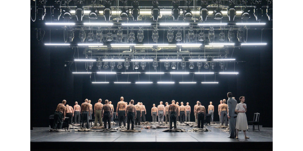 „Spuren“ erzählt, wie eine junge Frau (noch einmal sehr berührend: Elisa Badenes) nach Krieg und Lagern an der Seite eines Mannes (erneut recht farblos: David Moore) in ein normales Leben zurückkehrt. Kaum erträglich ist für sie die Oberflächlichkeit, die Gleichgültigkeit der Gesellschaft, die von den Gräueln der Vergangenheit nichts weiß oder nichts wissen will, symbolisiert durch fünf Paare, die Jürgen Rose in einfarbige Vintage-Kleider gesteckt hat. Die Spuren des Überstandenen holen die Frau hier wieder ein, die Dämonen und Schrecken der Erlebnisse, personalisiert durch einen kahlgeschorenen Mann (beeindruckend: Martí Paixà). Und es gehört zu den grandiosen Kunstgriffen Crankos und Roses, dass sie hier die Statisterie in sackartige Gewänder gesteckt haben, die sie beim Höhepunkt in Mahlers Musik, bei diesem dissonanten Verzweiflungs-Crescendo, unter dem grellen Licht der heruntergefahrenen Scheinwerferbatterien fallen lassen, wobei auf den Rücken geprägte Nummern sichtbar werden. Aber letztlich siegt die Hoffnung, wenn das Paar gemeinsam einem sich am Bühnenhintergrund öffnenden Lichtquadrat entgegenschreitet.