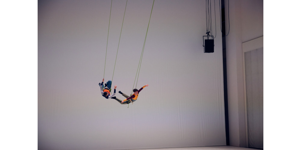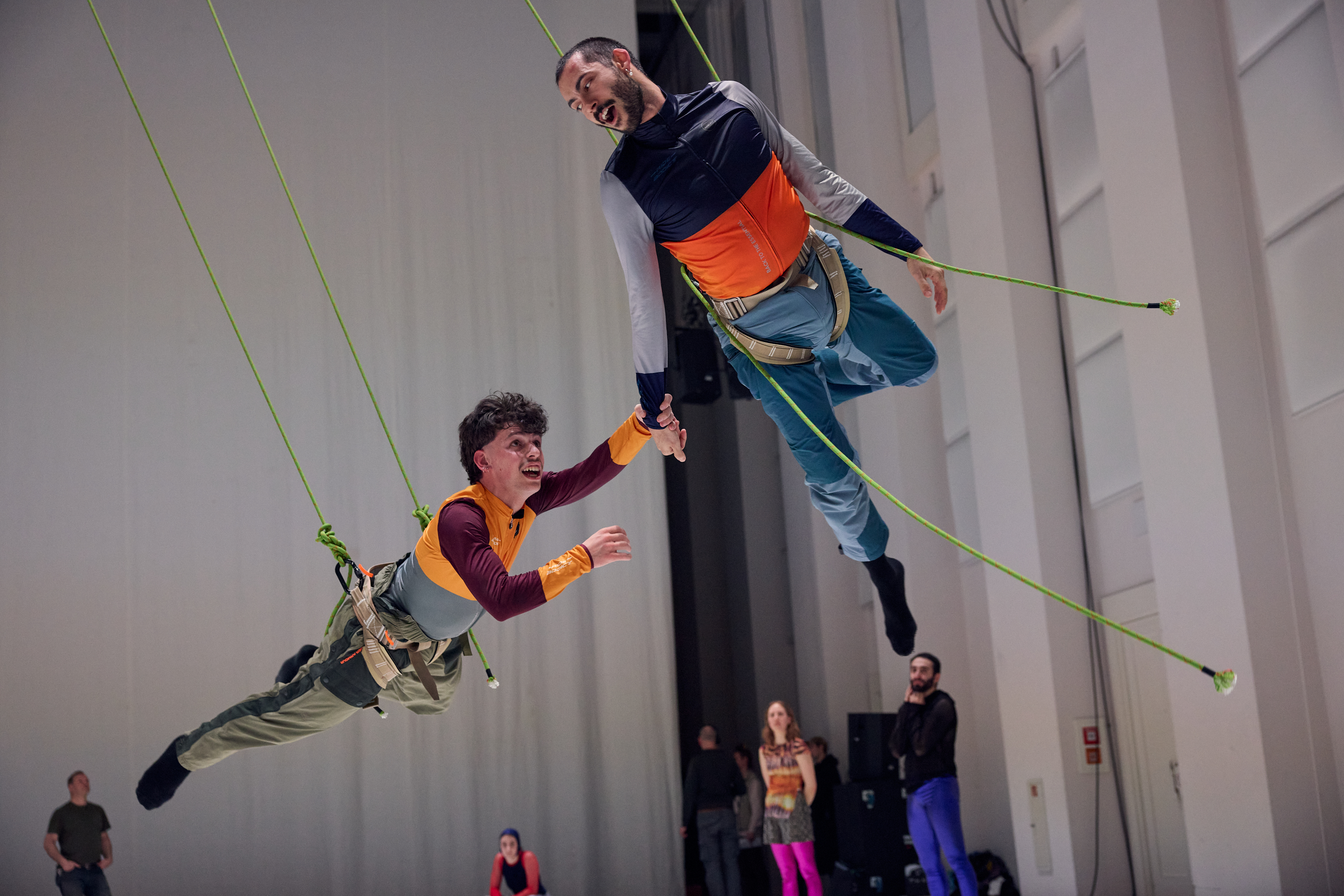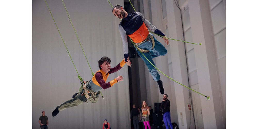 Das ist möglich, aber für die Rezeption im Grunde unerheblich, da alle Räume ihre ganz eigenen Wirksamkeiten entfalten, weit entfernt vom Überbau solcher dramaturgisch-philosophischer Konzepte. Da hämmert es etwa lautstark an den Wänden des „Black Pit“, während im großen Saal Emanuele Co’ und Emanuele Piras von der Bühnentraverse hängen und mit kräftigen Bewegungen mal kreisrund über den Köpfen der Zuschauenden schweben oder sich gegenseitig in der Luft herumwirbeln. In den „Black Pit“ wiederum, einen großen Black Cube, kann man nur von oben hereinschauen, während unten Daniel Myers und Audrey Dionis lautstark gegen die Wände hämmern und hier zumindest der aggressive Teil zunächst im Vordergrund steht. Später wiederum haben beide ihre pinken und blauen Netzoberteile abgelegt und auch die Hand- und Knieschoner zu Mustern zusammengelegt und ergeben sich einander zärtlich zusammengerollt.