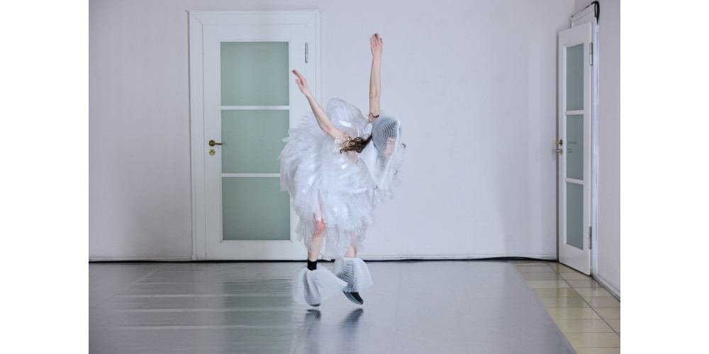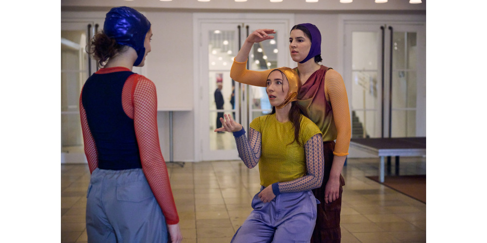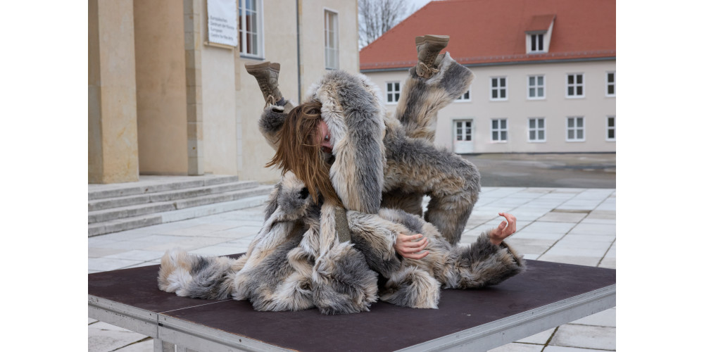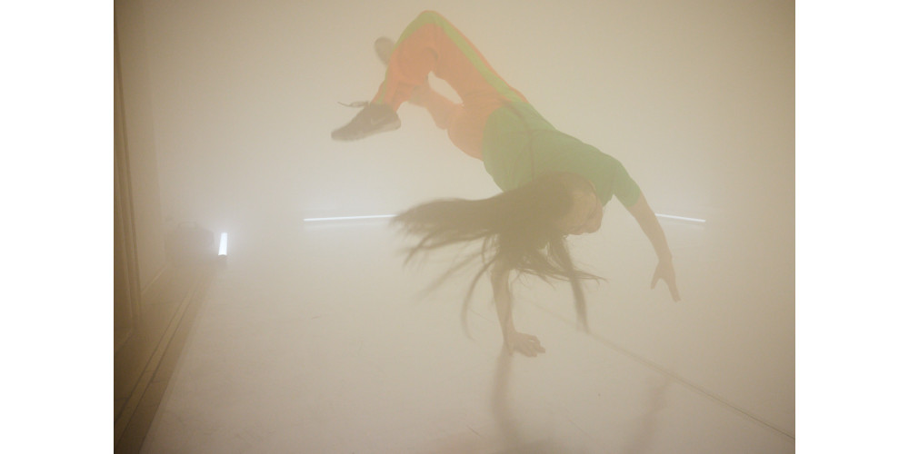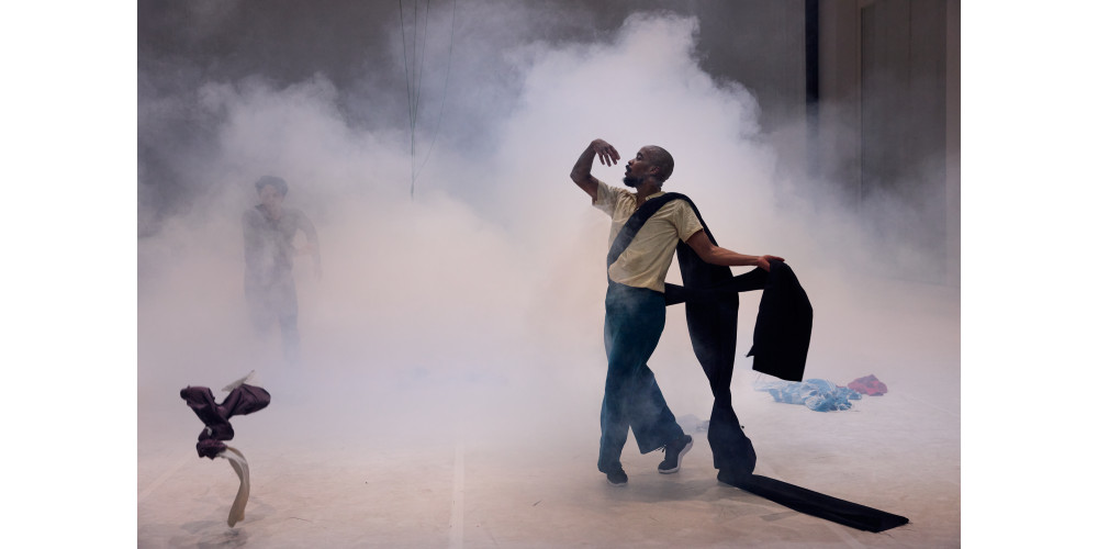 Im „Smokey Valley“ wiederum ist tatsächlich alles komplett vernebelt, und nur hier und da taucht der grün gekleidete Ichiro Sugae oder eben ein anderer Gast aus der dichten weißen Masse vor die Augen. Im Foyer tanzen Noémie Larcheveque und Todd Baker als zwei Fellwesen. Louella May Hogan zunächst ganz in Schwarz, später in weiß, bespielt den Treppenaufgang. Thomas Bradley reinszeniert in Ansätzen Abramowitsch’ „The Artist is Present“ und spricht über Identitätskrisen, und im „Rainbow Valley“ musizieren Cassandra Arnmark und Ido Toledano gar selbst und laden die Besuchenden der Kassandra-Liebes-Story zu einer großen Party ein. Mittendrin gibt es zudem einen Walking Act mit Marina Kladi, Solène Schnüriger und Ugnė Irena Laurinavičiūtė, die dann wiederum mit den stationär Tanzenden in Dialog treten.