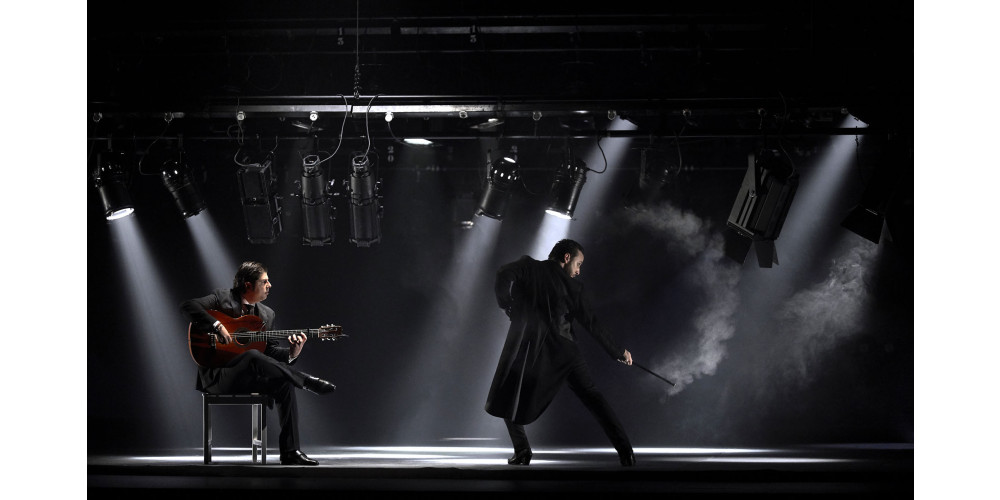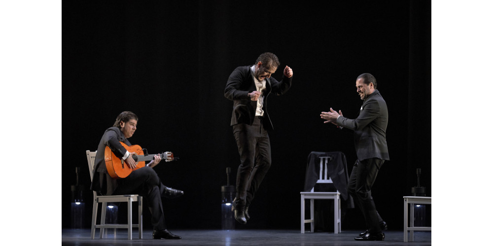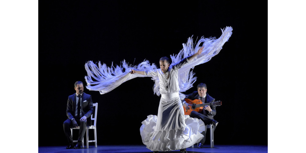 Sie waren das Kernelement der vom Publikum gefeierten puristischen Show, stilecht arrangiert mit Gitarristen und Sänger. Routiniert schlüpfte Liñán in wechselnde Rollen und unterschiedliche Kostüme (Frack, offenes Jackett, weißes Hemd und zuletzt weißer Rüschenrock mit Schleppe und Fransentuch). Insgesamt dominierten dabei die lauten, oft raue Töne – leise wurde es erst ganz zum Schluss, als der Tänzer nach dem rauschhaften Schwingen von Fransentuch-Flügeln seine Sterblichkeit offenlegte.