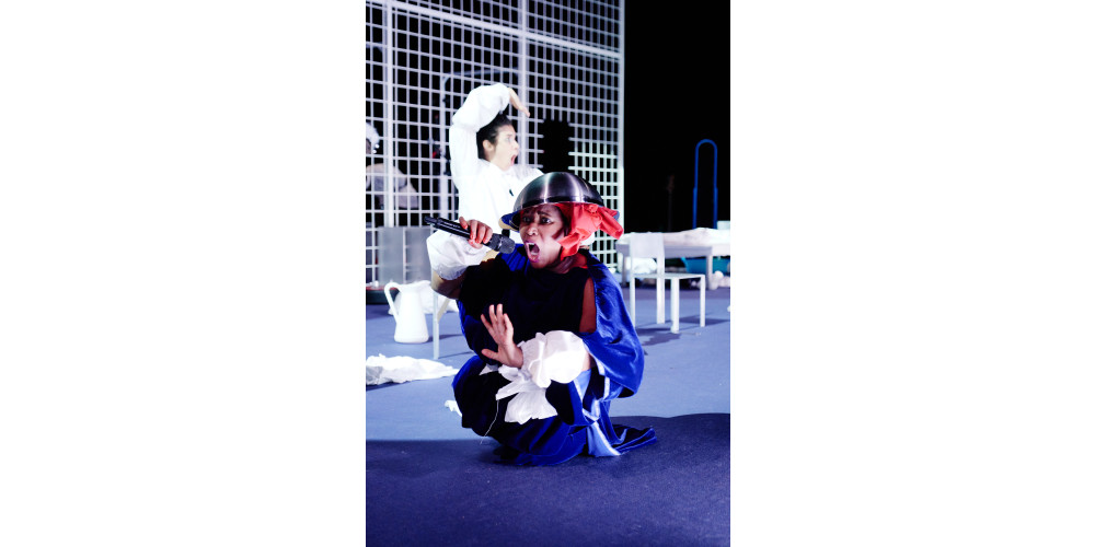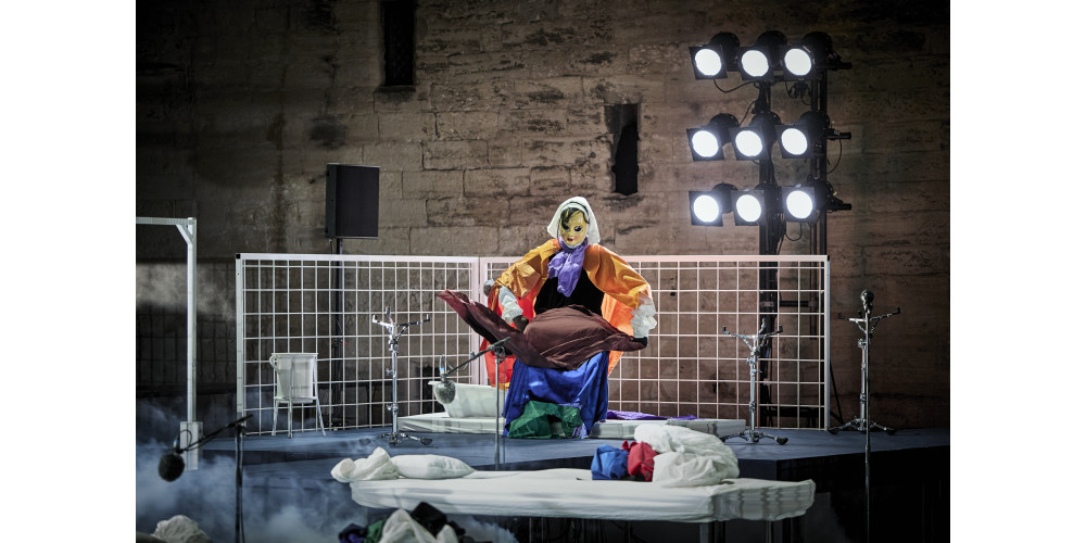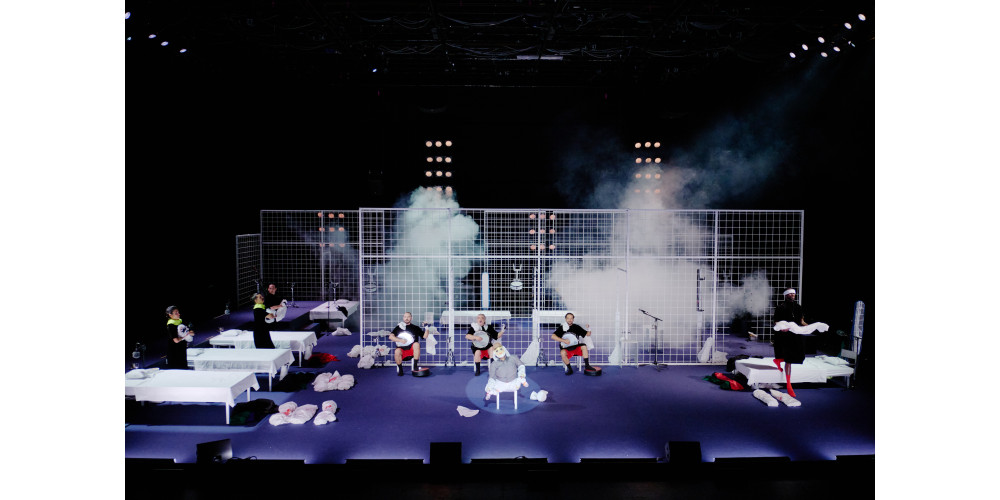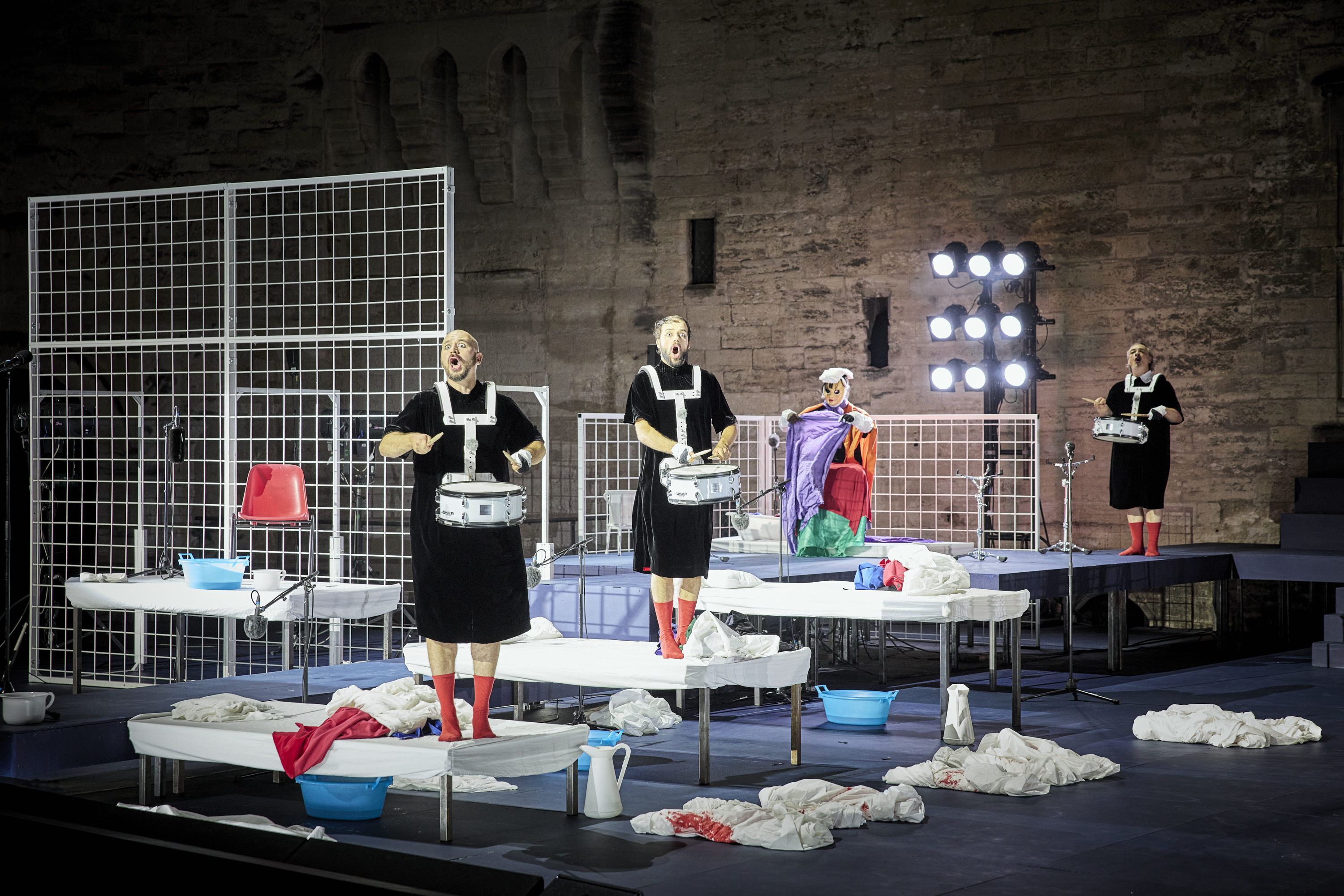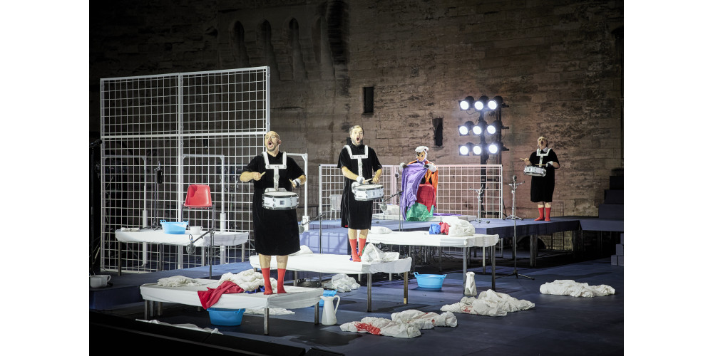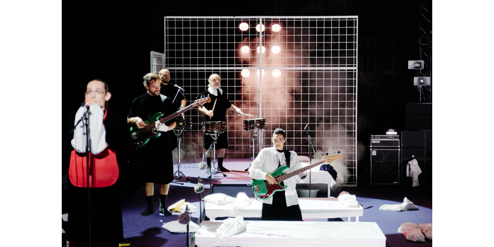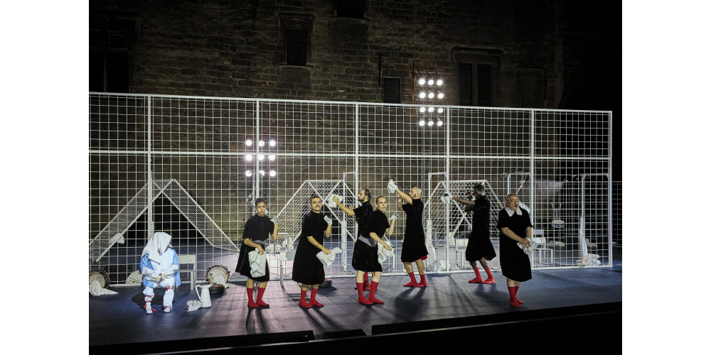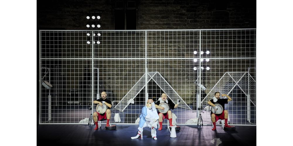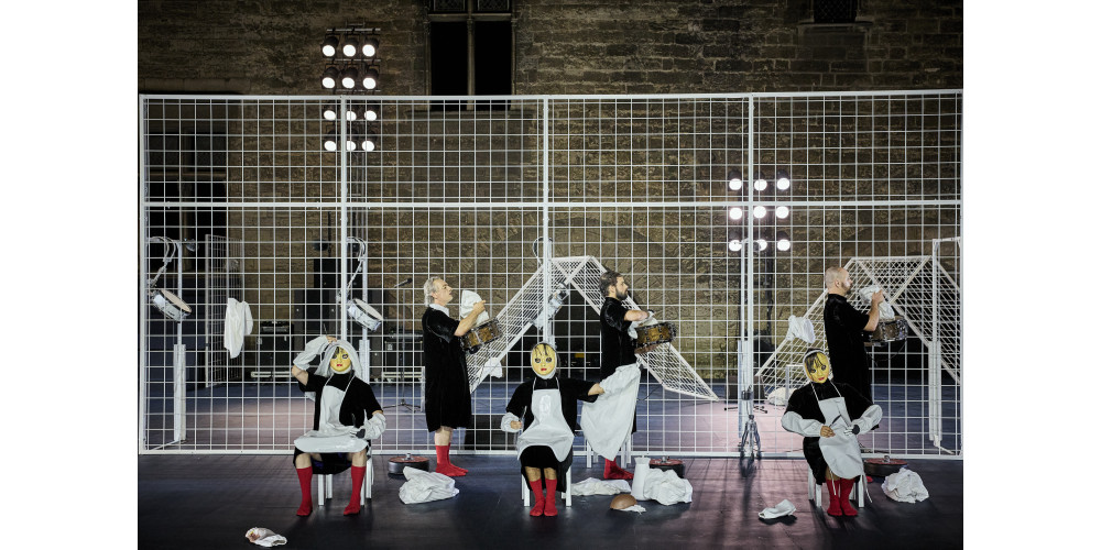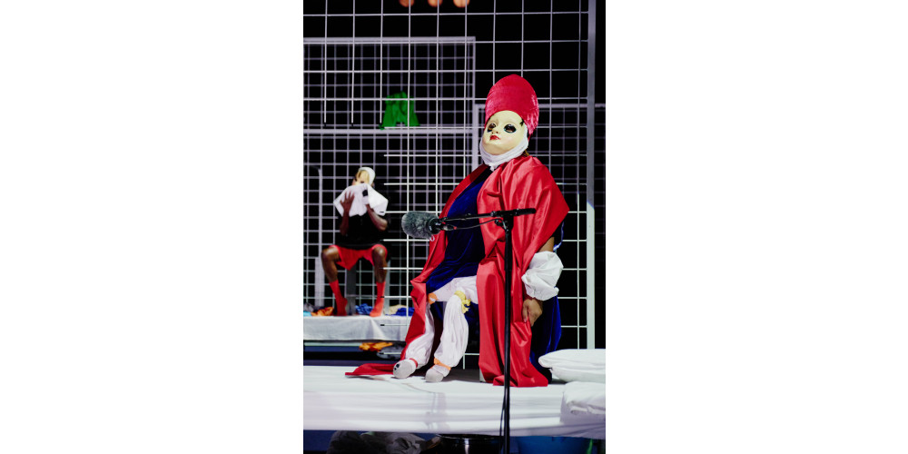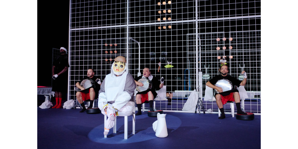 Es ist Geisterstunde im Haus der Berliner Festspiele, wenn das mit Avignon, Kampnagel und den Berliner Festspielen koproduzierte „Nôt“ die große Bühne entert. Marlene Monteiro Freitas, zusammen mit Florentine Holzinger designiertes Mitglied der neuen Volksbühne-Leitung unter Matthias Lilienthal, lädt in die Nacht – das bedeutet der Titel im kapverdischen – oder vielmehr in eine 70-minütige groteske Alptraumshow, die mitunter zirkensische Züge annimmt. Da gibt es große Gesichtsmasken, die an Chucky die Mörderpuppe mit der Frisur einer Mit-Dreißigerin erinnern, unendliche Nummern vom Abziehen von Betten oder das unvermittelte Auftauchen und Verschwinden eines Kardinals in Ornat auf der Hinterbühne, auf die man durch das weiße Stahlgestängebühnenbild von Yannick Fouassier und MMF blicken kann. Alle laufen abstrakt in 90 Grad-Winkeln über die Bühne. Hinzu kommt ein Licht von Yannick Fouassier , dass immer wieder aktiv falsche Foki setzt und Lichtstimmungen kurz aufscheinen lässt, die aber mit der Szene nichts zu tun haben. Dazu erklingt Igor Stravinskis Chorstück „Les Noces“, das eine weitere, nicht gerade beruhigende Ebene in dieses Tollhaus einfügt. Zudem noch drei hervorragende Trommler und Percussionisten, die mal strammen Beat geben und mal das ganze Feld in eine Samba-Party verwandeln. Die drei sind offenbar ansteckend, denn am Ende spielen gar sieben Trommelnde gleichzeitig.