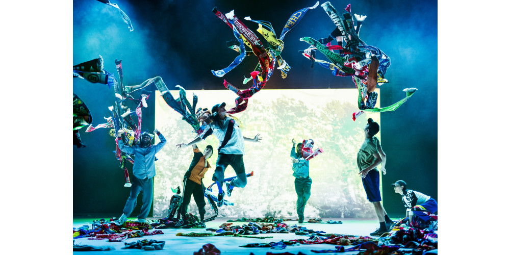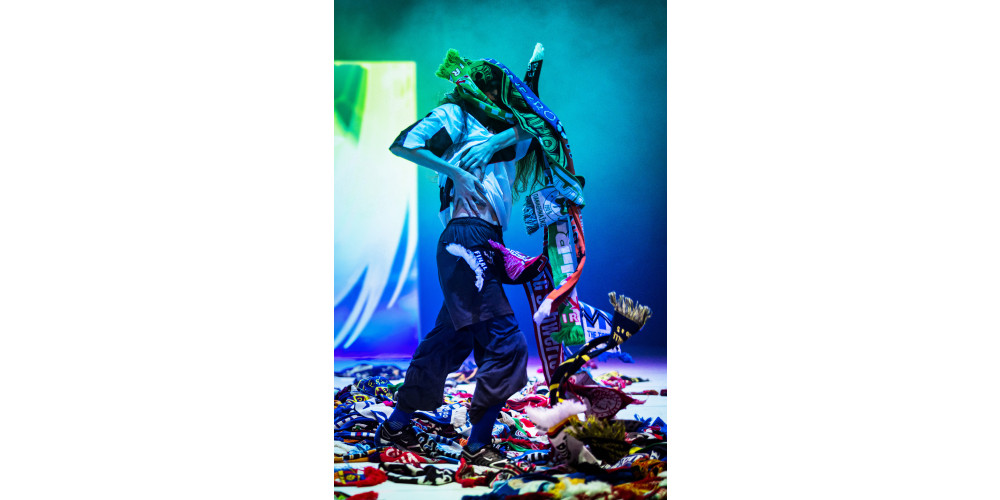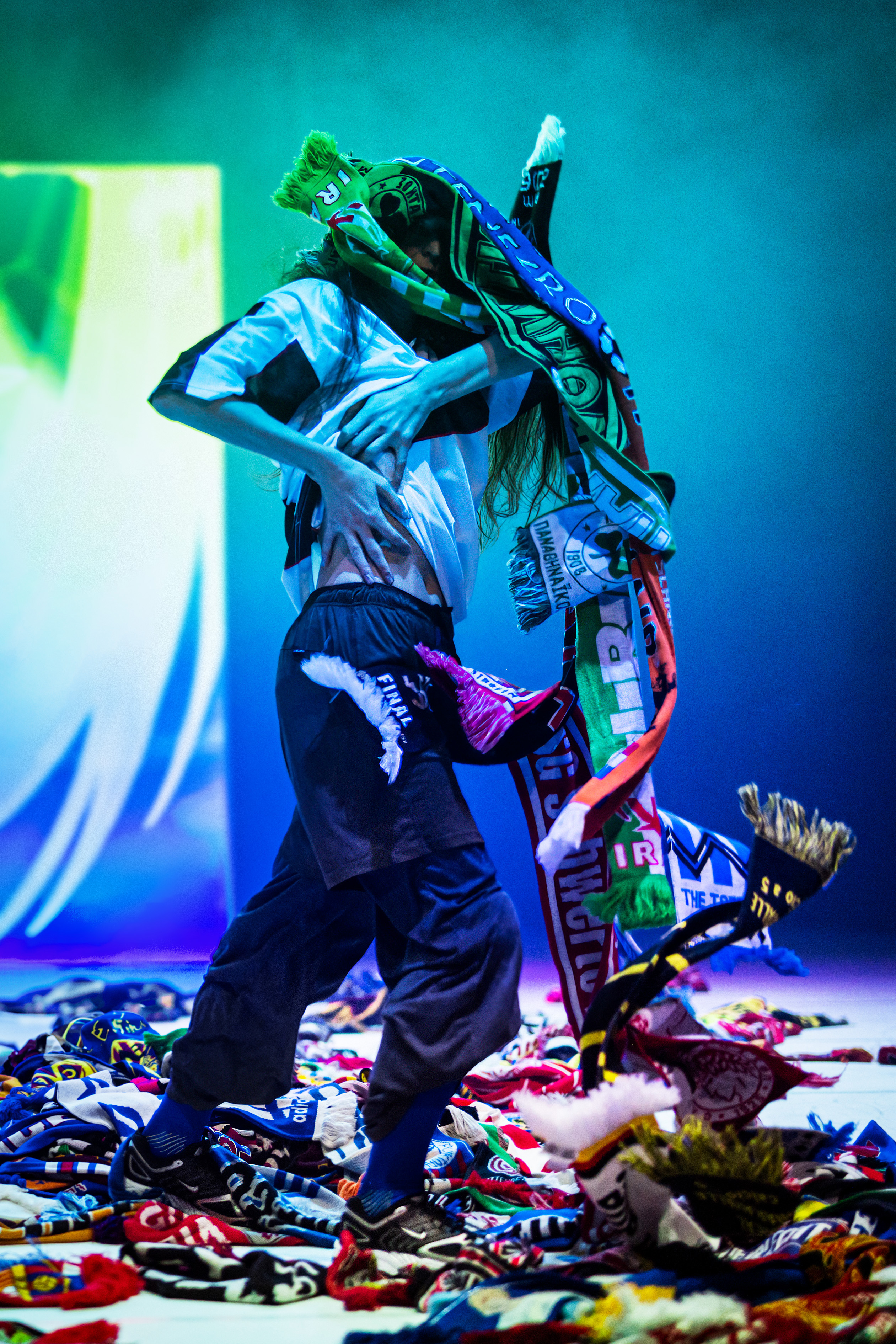 Fein säuberlich haben die acht Tänzer*innen sie in der Muffathalle zu einem Flickenteppich ausgelegt: Gut 500 Fanschals, so bunt und wahrscheinlich so wenig Öko wie Plastikmüll auf einer Deponie. Nur eben viel ordentlicher und voller ex- und impliziter Botschaften. „1899 Hoffenheim“: Behauptete Tradition! „Germany vs. England“: Hier clashen spielerisch Nationen. „Sauerland Power“ und „High as fuck”: energetische Zustände.